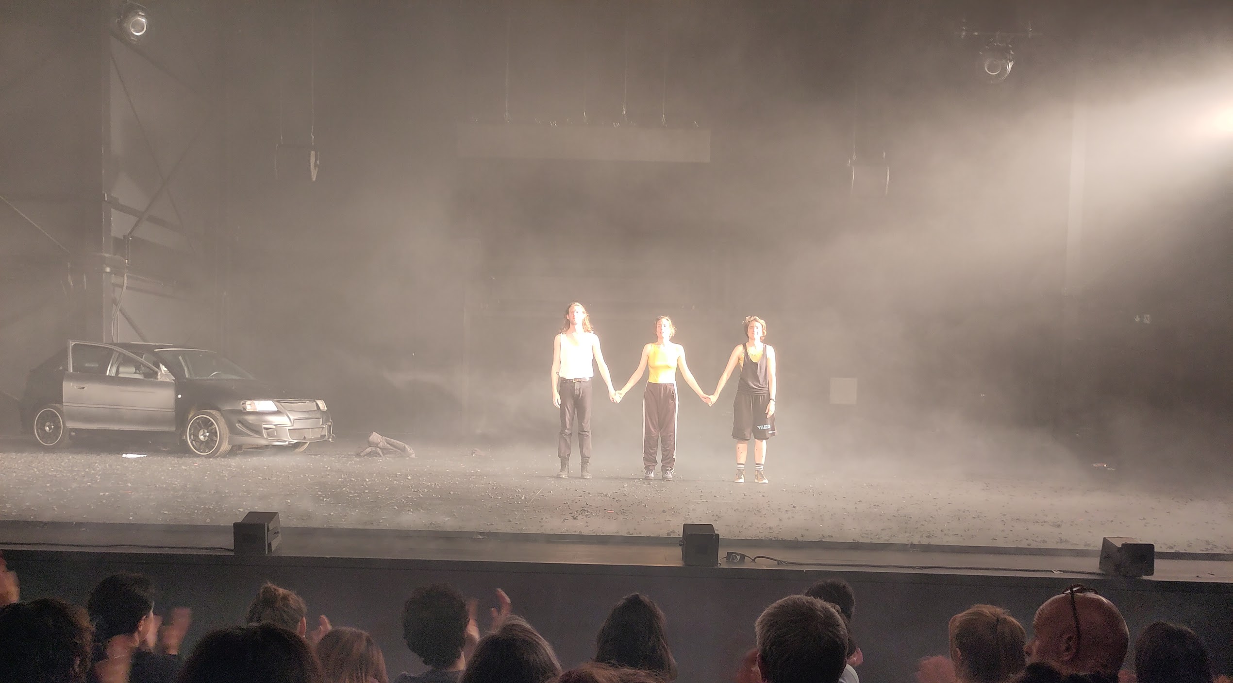 Une voiture ou une carcasse de voiture, telle notre société cadenassée. A l’intérieur, deux jeunes. Iels sont frère et soeur. Ce soir, soir de fête, iels se sont souvenus ou ont pu en parler. De quoi? Du viol qu’iels ont subi enfant par leur grand-père. Iels en ricanent, le tournent en dérision, plaisantent.