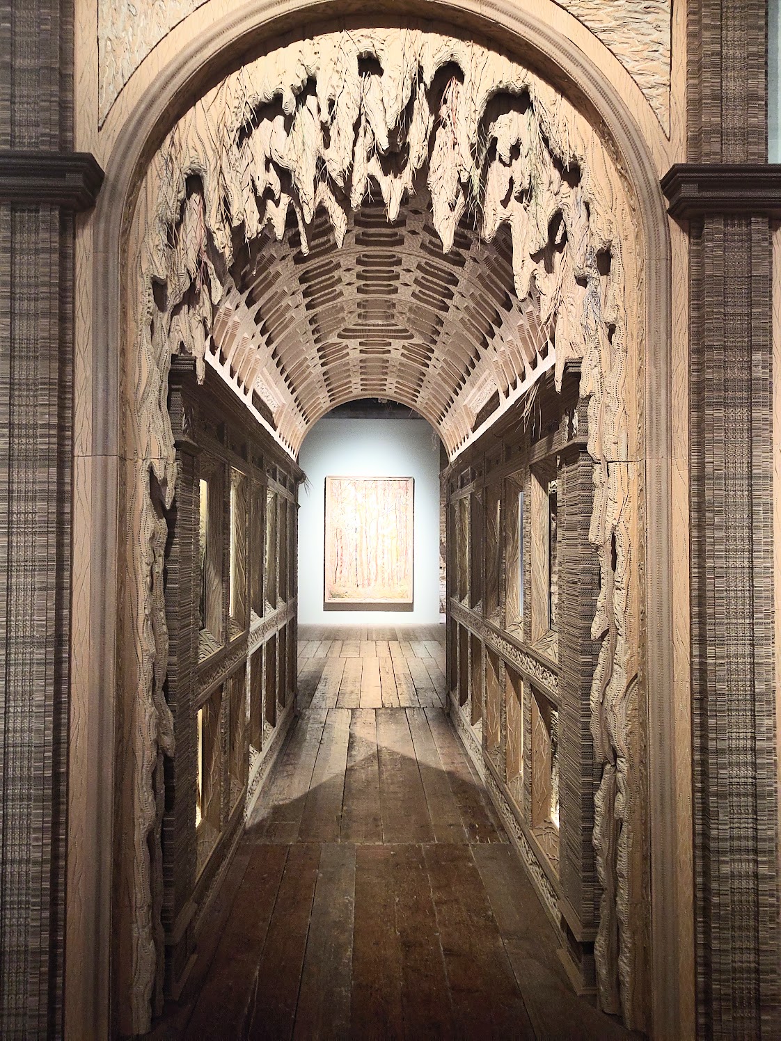 Le palazzo Fortuny expose au rez, quelques oeuvres d’Eva Jospin, son univers sylvestre mystérieux fait de carton et ses tapisseries brodées enchantées. Dans la semi obscurité du palazzo, Selva est une entrée monumentale, quelques dessins, des petits tableaux en relief magnifiques (mais qui ne donnent rien en photo) et de grands paysages en broderies. Deux vidéos embarquent dans des promenade en forêt dessinée et cartonnée. Une grande boîte à musique avec bande de papier dessiné et ajouré par l’artiste n’était pas en fonction.