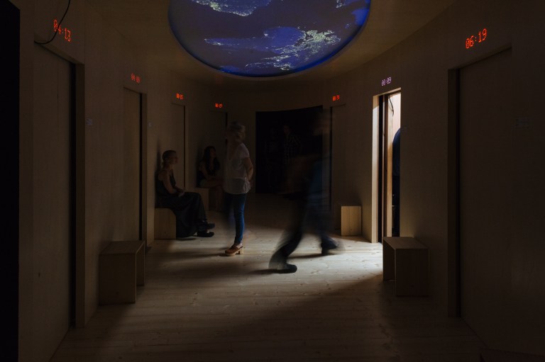 Nachlass, « ce qu’on laisse après », est une installation plus qu’un spectacle. Elle a été préparée avec soin et de longue date avec des professionnels de divers domaines scientifiques ou religieux, hôpitaux ou pompes funèbres. Pour ensuite accueillir les idées et désirs des neuf protagonistes, créateur.ice.s des chambres. L’espace est une salle ovale bordée de huit portes. Au plafond, une carte mondiale montre une simulation localisant la fréquence des décès dans le monde. Un.e guide oriente les groupes de 6 personnes vers les chambres que l’on visite une par une. Chaque lieu développe (brièvement) son histoire particulière. Chaque chambre où nous entrons a été élaborée et garnie par la personne elle-même, et nous entendons sa propre voix.