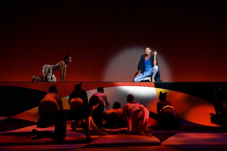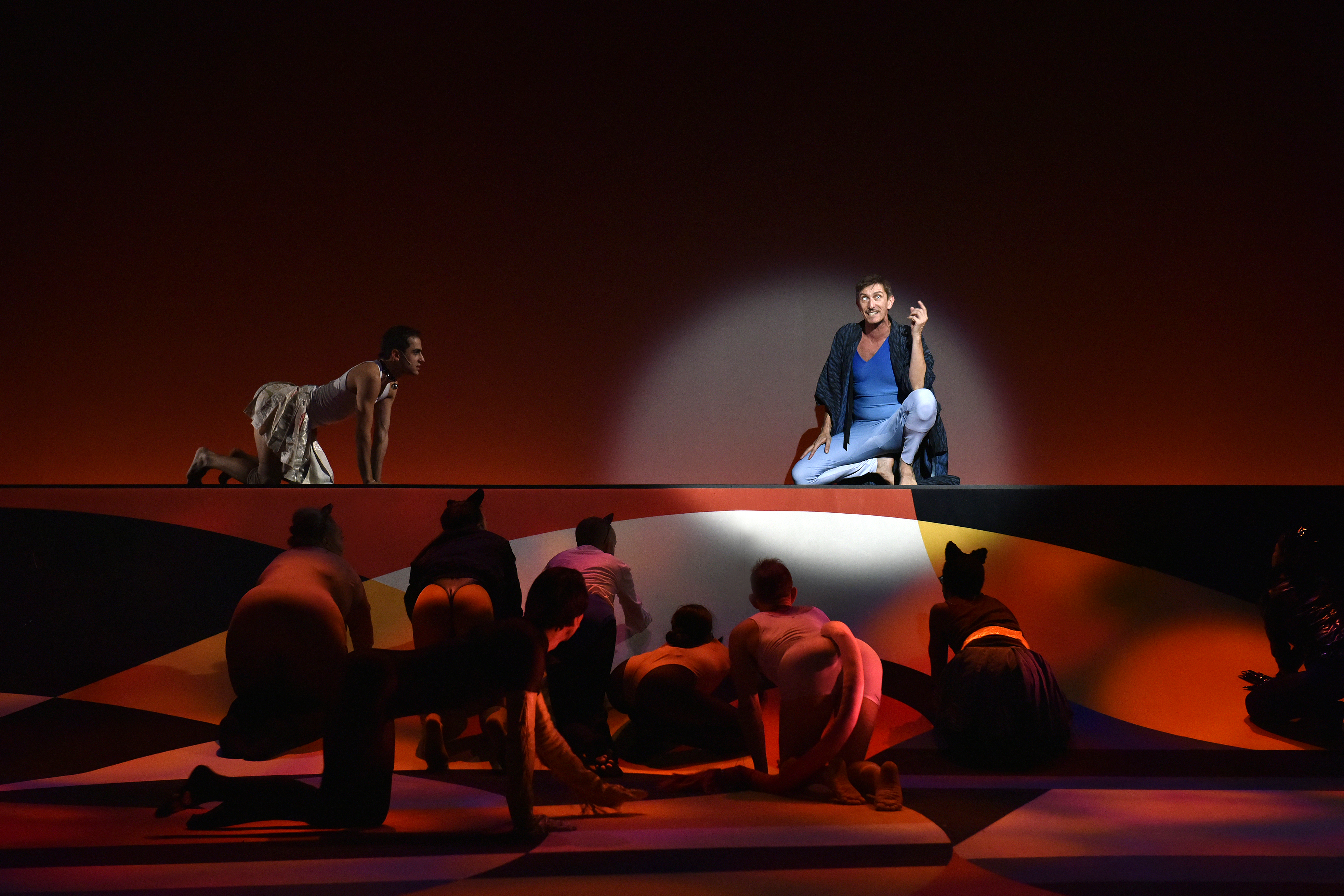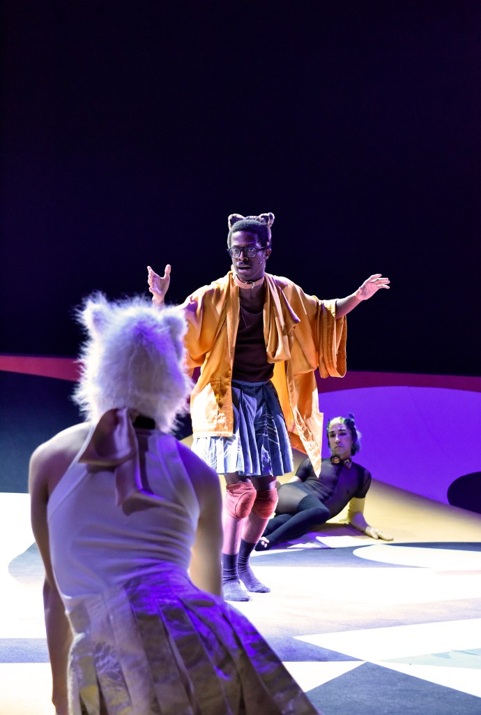 Une moderne moquette multicolore, formant une pente sur le fond de scène, est leur lieu de vie: une très belle scénographie de Théo Mercier. Chaque chat.te possède son propre tempérament et développera son questionnement, raisonnement et opinion personnelle tout au long de la pièce. En effet chacun.e aura l’occasion de s’exprimer par un monologue, tandis que les autres écouteront, danseront, chanteront ou se prélasseront.