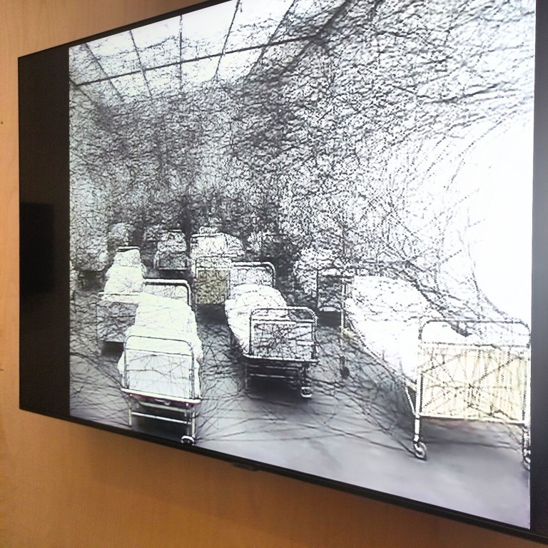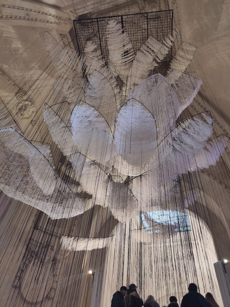 Parmi les sept installations monumentales que présente l’exposition, voici la première, celle qui accueille les visiteureuses en haut de l’escalier d’entrée. Ce que l’on pourrait interpréter comme des nuages ou des ailes sont en fait des barques, objet symbolique présent dans plusieurs oeuvres de Shiharu Chiota, le blanc représentant la pureté. (ICI, présentation de l’artiste)