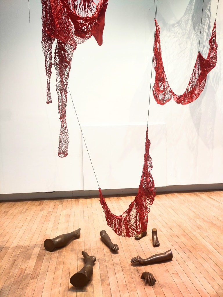 Ici, ces morceaux de corps en bronze ont été moulés sur l’artiste. Des pièces de cuir lévitent au-dessus. Elle évoque l’idée du corps séparé de l’âme.