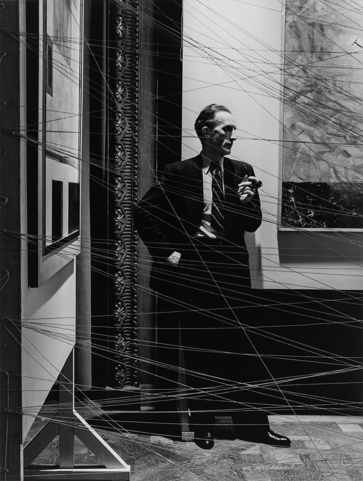 Marcel Duchamp [1942] Behind « Mile of String ». First Papers of Surrealism, New York. Photo by Arnold Newman.