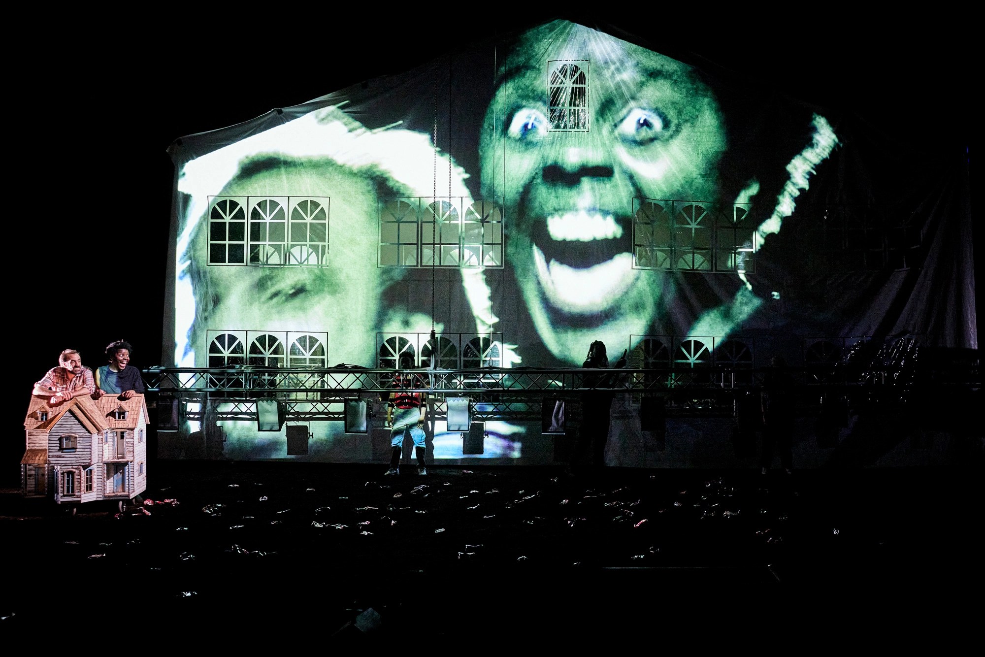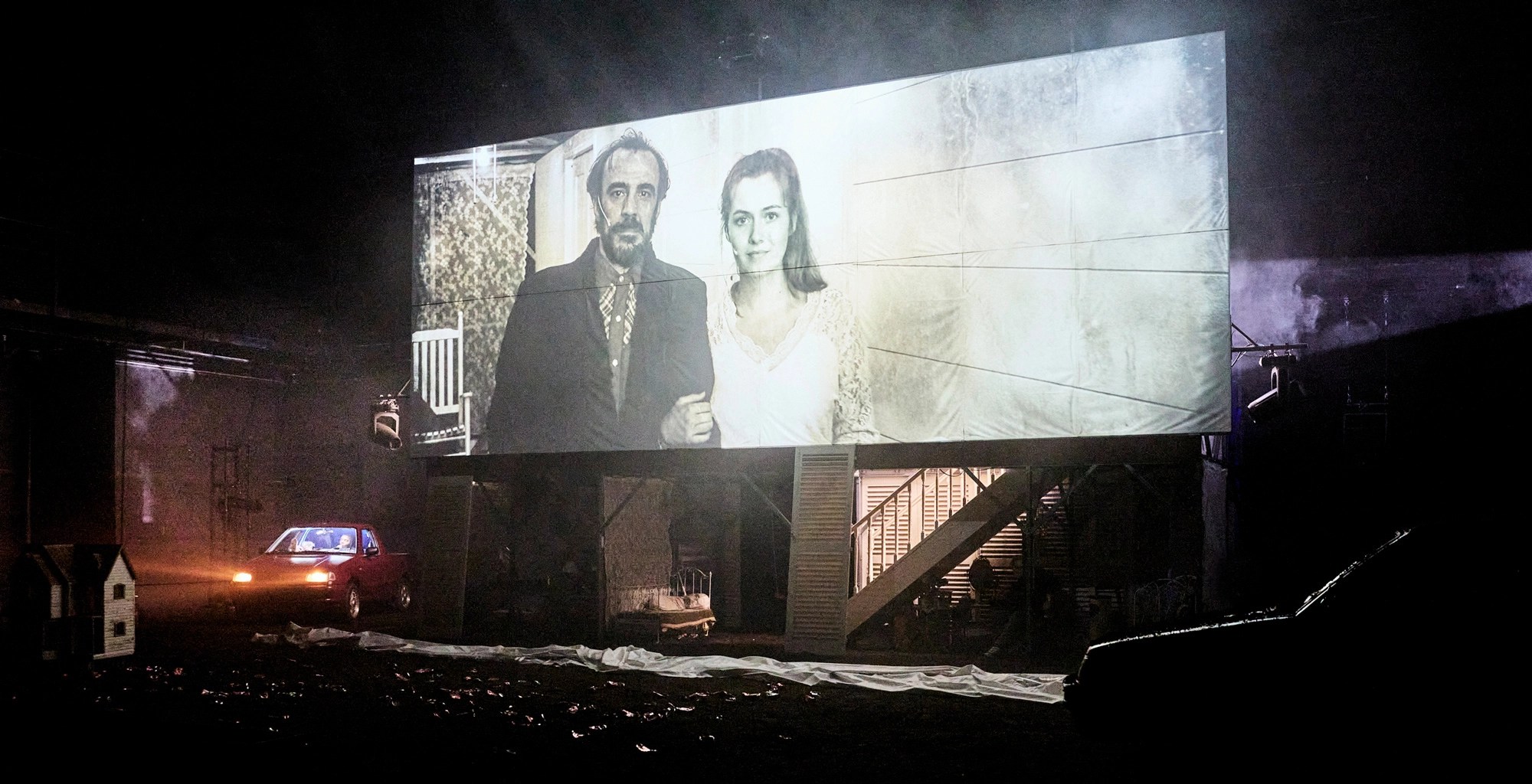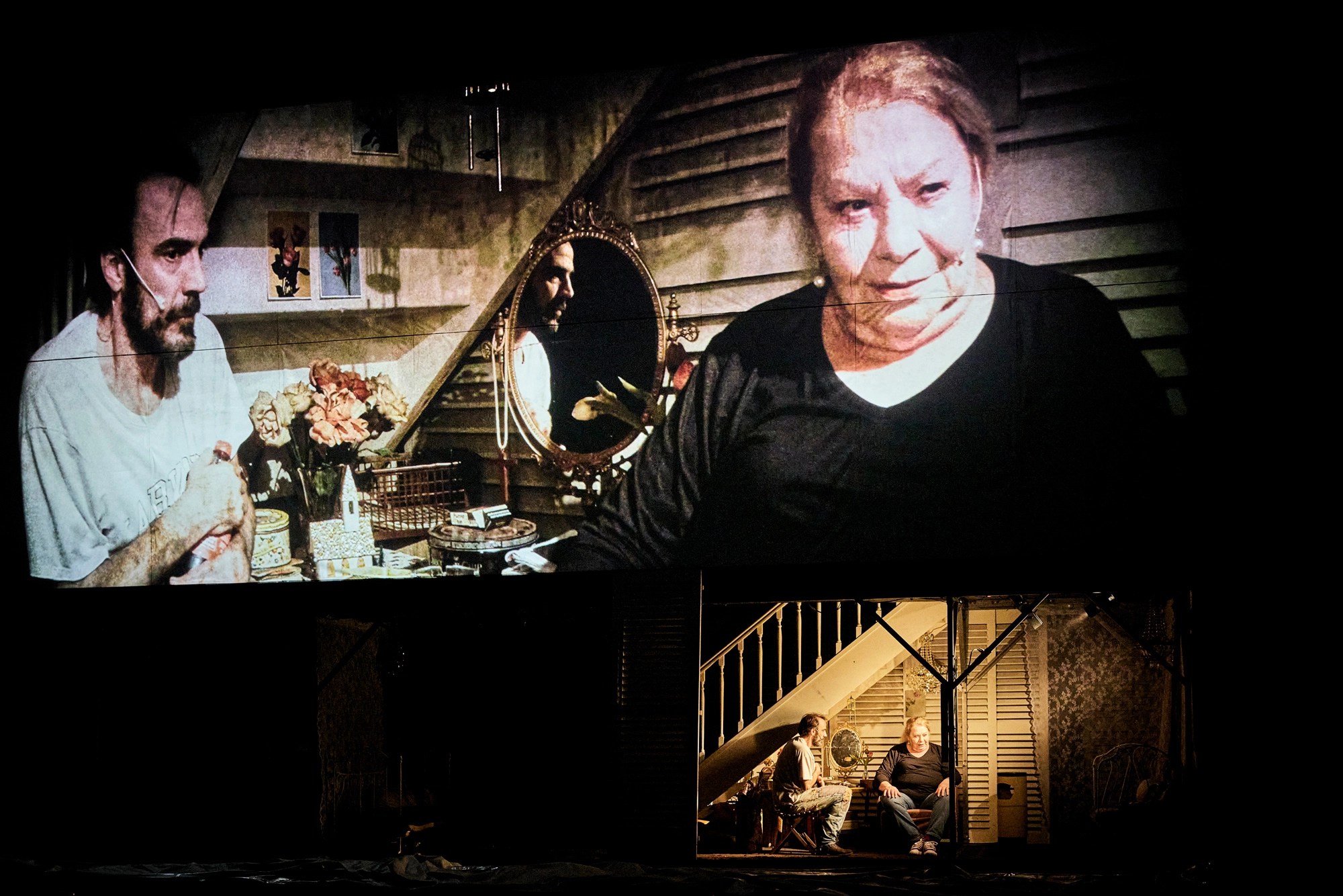 Le procédé de filmage reste invisible tout au long de la pièce: pas de caméra visible. Les acteurices sont filmés en gros plans dans les véhicules (un pick up et une voiture) ou dans et devant la maison. On nous montre la réalité dans le plan global de la scène de théâtre et simultanément leur image cadrée en gros plan ou plan rapproché, à choix. Les images filmées ne se réduisent d’ailleurs pas aux visages, mais aussi aux parties de corps ou aux objets. Deux fois la scène sera jonchée de canettes de coca, puis de poupons.