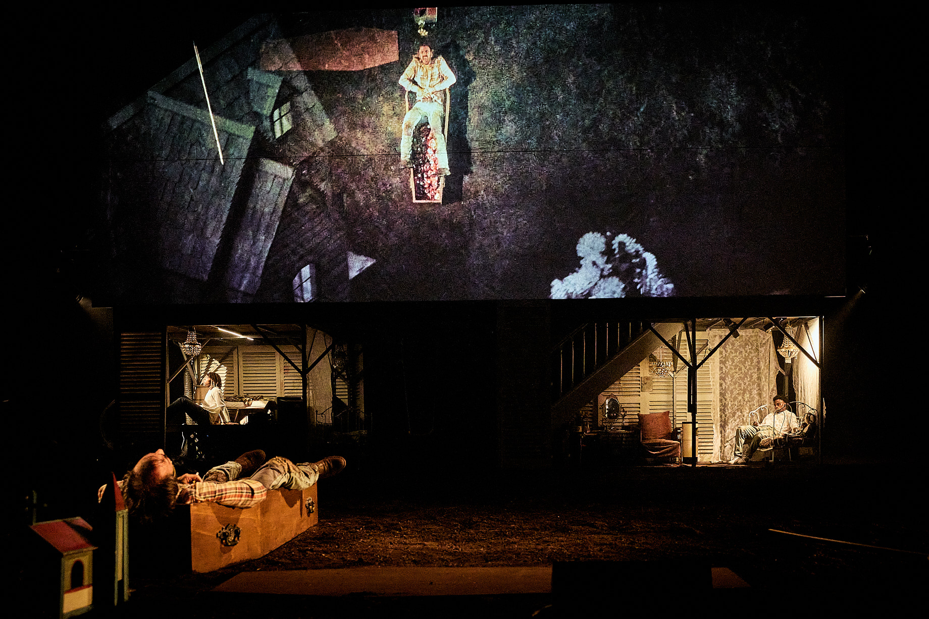 La monumentale scénographie est à la hauteur du monument littéraire et de William Faulkner, grandiose écrivain américain de culture sudiste. Le roman « Absalon, Absalon! » (remarquez la différence de ponctuation), publié en 1936, raconte l’accession à la richesse puis la déchéance de Thomas Sutpen. Partant d’une humiliation de jeunesse, celui-ci décide que sa vie sera consacrée à bâtir une dynastie à son nom. Se déroulant durant la guerre de Sécession, c’est aussi toute l’histoire d’un pays qui sous-tend le roman. Quentin Compson, petit-fils du seul ami de Sutpen, obsédé par cette famille dysfonctionnelle, régie par un patriarche violent, raciste et misogyne, veut percer leur mystère. Il s’entretient donc avec des témoins, puis raconte l’histoire à son ami Shreve. Mensonges, trahisons, meurtre, inceste, fratricide, viol sont les ingrédients inhérents de cette saga aux allures mythologiques.