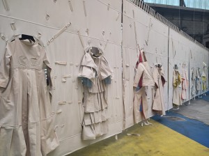 Nefeli Papadimouli (1988) expose deux murs de costumes dont une seule face est colorée . Ce sont des créations originales destinées à demeurer vides et donc »en grève » ou à être endossées et ainsi être en mode « en action » grâce à des performeur.euses. La présentation est un peu sauvage, en attente d’agentivité. Nous n’avons pas eu l’occasion de les voir vivre.