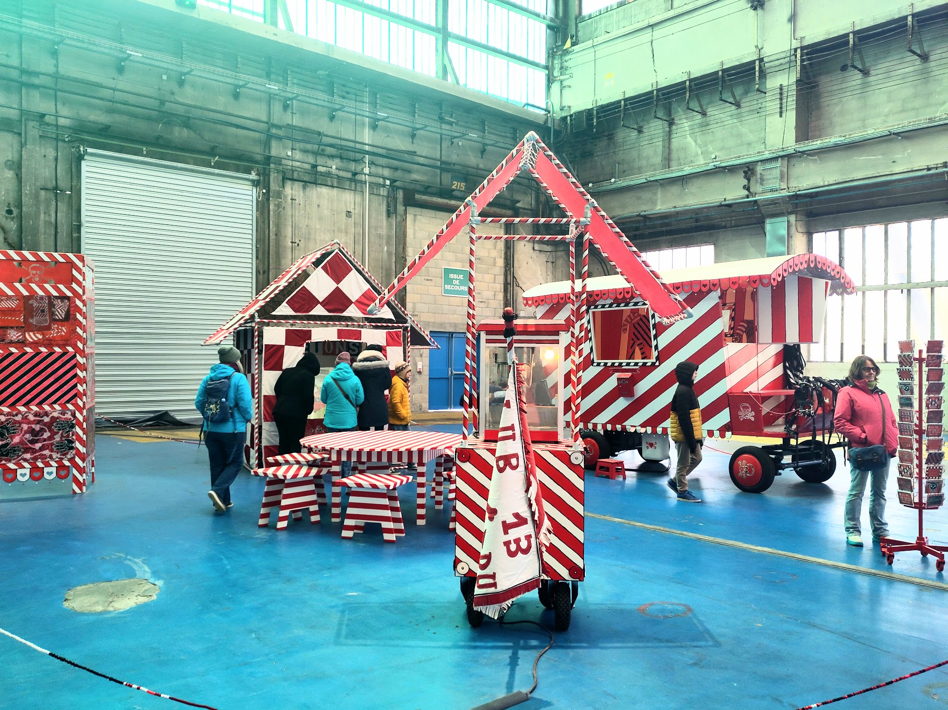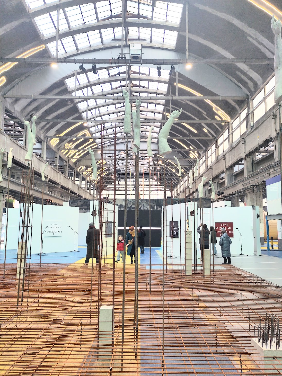 Anciennes usines créées en 1846, cet immense complexe consacré aux chemins de fer est désaffecté en 2019. Les artistes y évoquent « le voyage et le déplacement, la réparation et le soin, la force du collectif et de la contestation ». Gardez vos manteaux! Voilà à quoi cela ressemble en entrant: