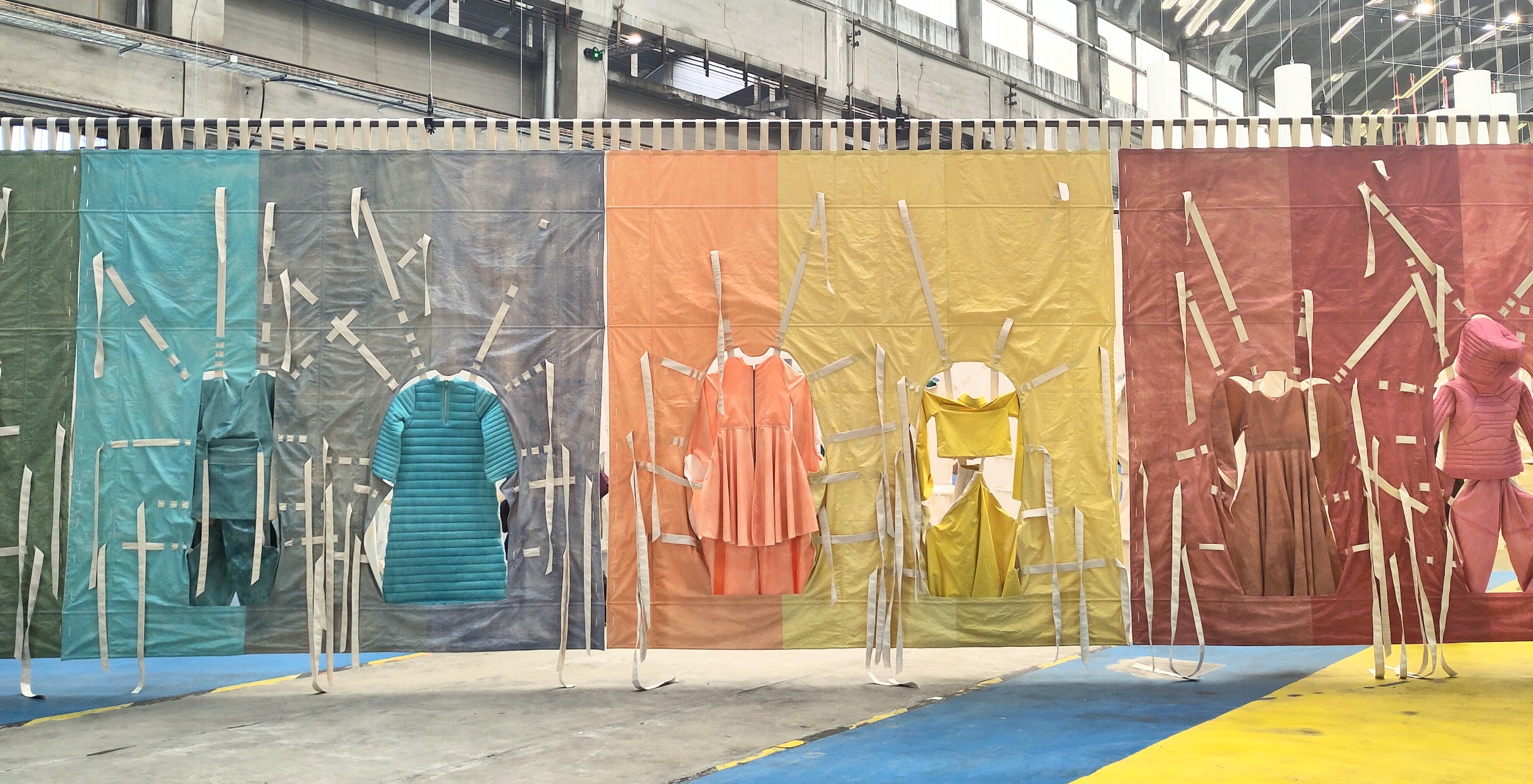 Nefeli Papadimouli (1988) expose deux murs de costumes dont une seule face est colorée . Ce sont des créations originales destinées à demeurer vides et donc »en grève » ou à être endossées et ainsi être en mode « en action » grâce à des performeur.euses. La présentation est un peu sauvage, en attente d’agentivité. Nous n’avons pas eu l’occasion de les voir vivre.