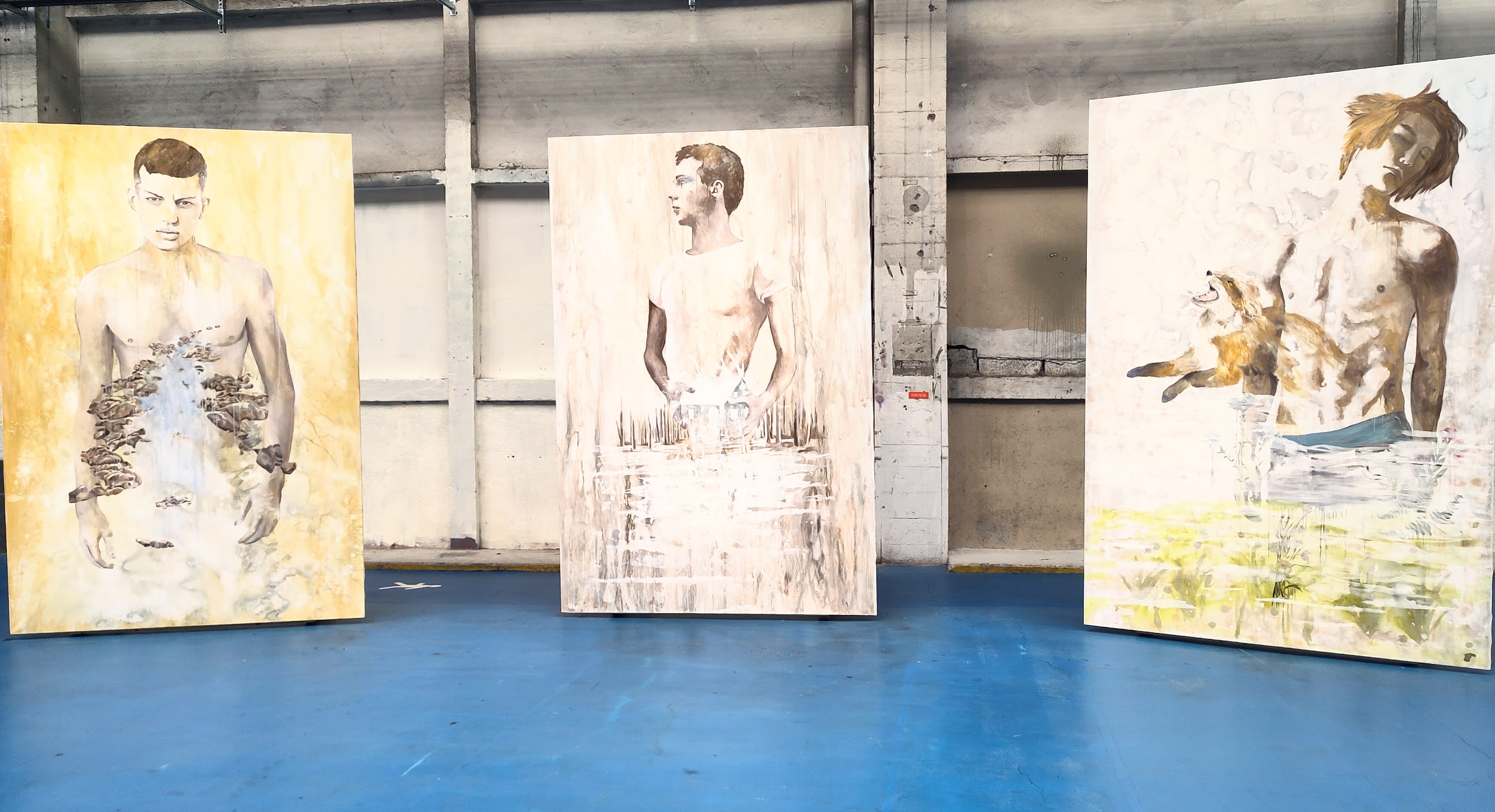 Trois grandes et magnifiques toiles représentant de jeunes hommes font face à un assemblage d’objets suspendus. C’est une reproduction du porte-bonheur personnel de l’artiste Edi Dubien (1963) qui revendique une autre forme de virilité.