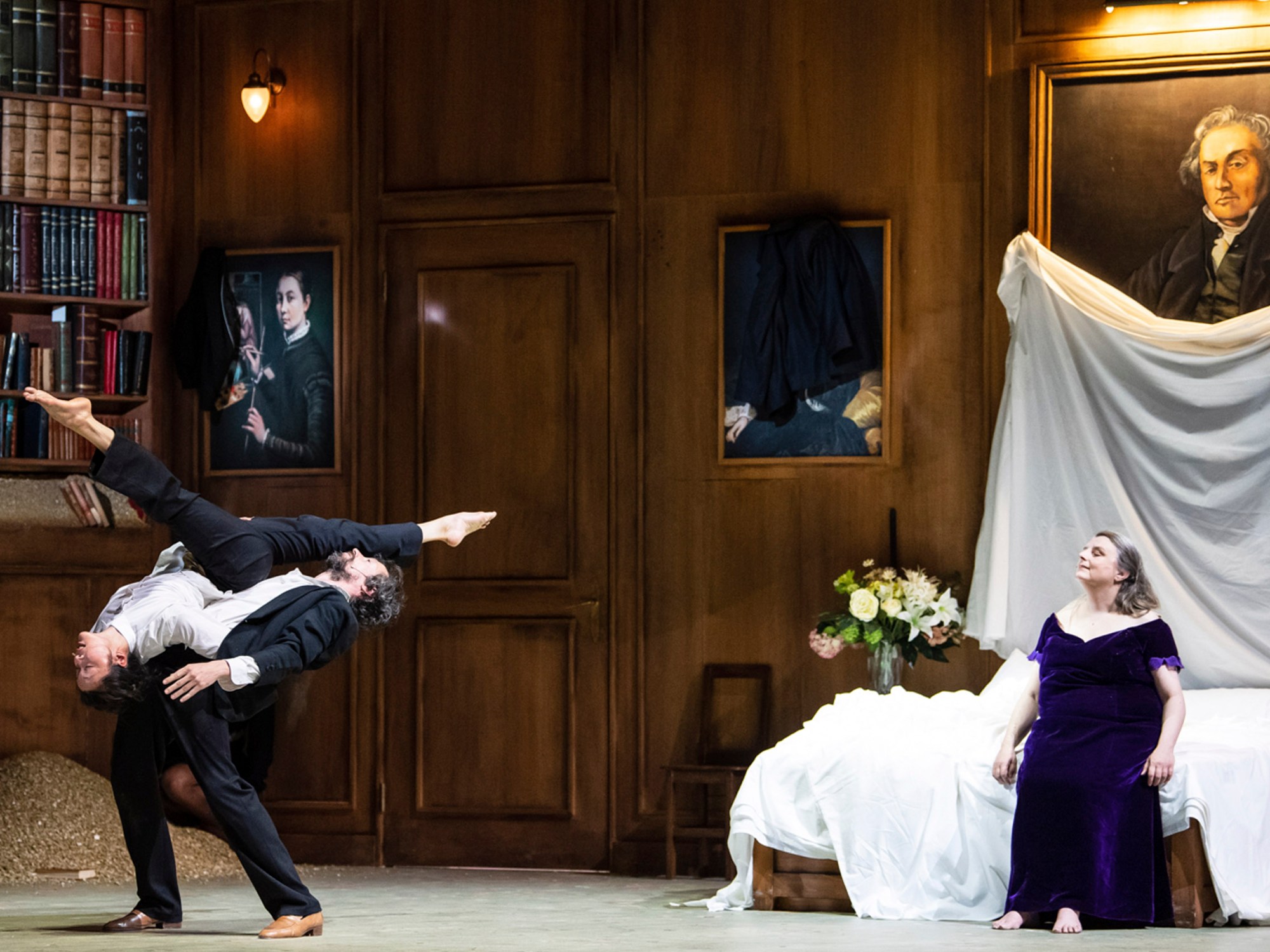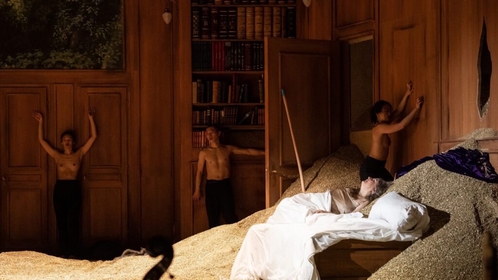 Les artistes de Peeping Tom animent cette scénographie (de la plasticienne Justine Bougerol) de leurs danses contorsionnistes, tout en faisant vivre les objets qui la définisse. Ainsi les tableaux bougent avec les corps, leur intimant des postures. Le lit, garni de plusieurs couches de draps blancs immaculés, devient une scène en lui-même, accueillant les protagonistes en des moments cruciaux. Le petit salon semble un lieu réservé au chant de la partition originale de Purcell. Il est lui aussi perverti par des évènements étranges: la théière sans fond, la mousse sur le violoncelle. On se retrouve dans un monde onirique à la Lewis Caroll, dont le surréalisme est entretenu par la danse démantibulée des domestiques de la vieille reine despotique et névrosée.