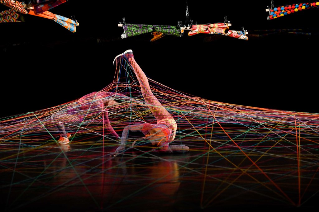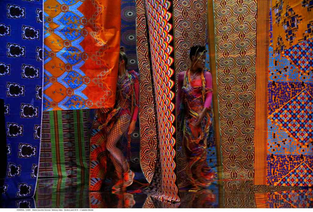 Le plateau du Pavillon de Vidy est entouré de somptueux tissu wax, produit issu de la colonisation hollandaise devenu emblème d’une identité africaine. Certains pans enroulés seront dévoilés en cours de spectacle. Des entrelacs de fils multicolores emplissent le sol d’une toile serrée que les danseuses continuent de tisser. Se glissant ensuite sous le réseau ainsi formé, elles instaurent de nouvelles configurations évoquant des dessins en 3D comme issus du web, des sculptures emprisonnées ou des paysages mouvants. Les fils de la toile, peu à peu découpés aux ciseaux, se superposent et s’emmêlent sur les corps des danseuses comme une troisième peau effilochée.