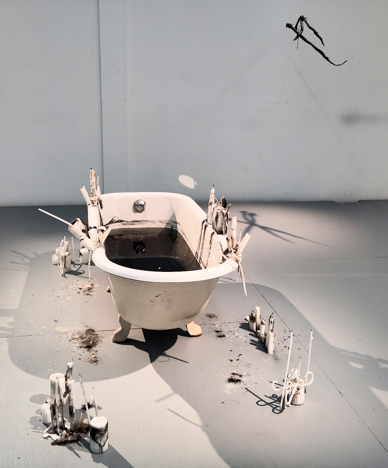 D’abord une installation, puis une performance. Centrale, une baignoire, l’endroit où l’on se lave, où l’on nettoie impuretés et souillures. Elle est entourée de bougies enflammées, jusque sur ses bords.