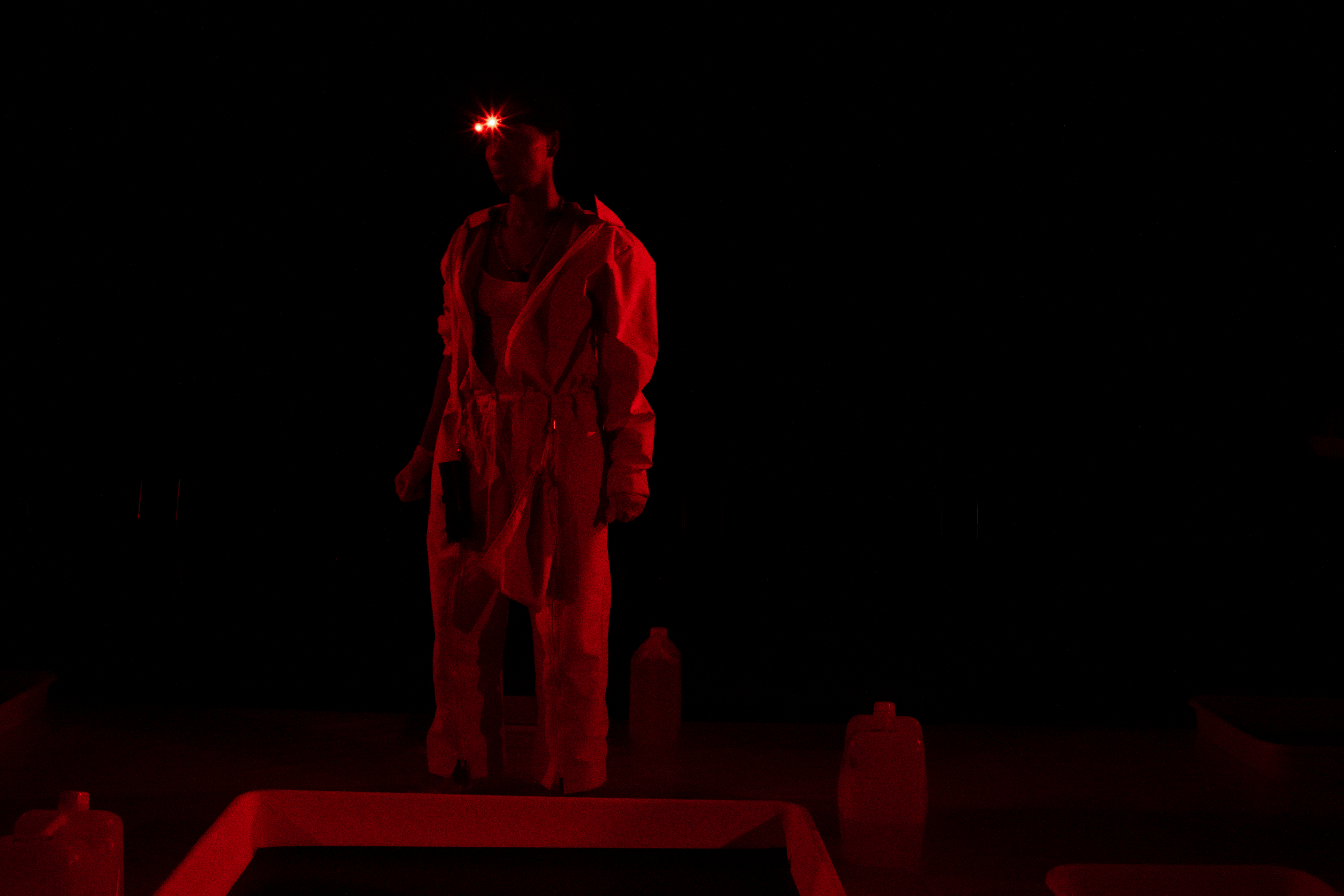 A l’origine de ce spectacle, un drame: la contamination au mercure de la rivière Tapajòs. Utilisé par les orpailleurs pour amalgamer et révéler l’or, le mercure est rejeté dans le fleuve et mute en méthylmercure, sa forme la plus toxique, provoquant de multiples dégâts sur tous les organismes vivants dont les peuples riverains comme les Munduruku. Le spectacle s’attache aux plus vulnérables, les mères et les enfants. L’autrice utilise l’analogie du liquide révélateur photographique argentique, toxique, pour personnaliser les victimes et combattantes de cette catastrophe. Tout un rituel est mis en place poar deux intervenantes, une sorte de liturgie en labo photo, célébrant les mères sacrées, assimilées à la vie de la rivière.