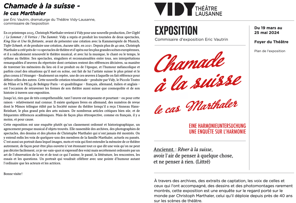 Vidy organise une exposition (commissariat Eric Vautrin) sur l’oeuvre de Christoph Marthaler dans le foyer du théâtre. Ce mythique metteur en scène et musicien zurichois au 110 spectacles « développe une esthétique du dérisoire, ancrée dans des décors du quotidien et l’histoire suisse.. Par la lenteur, l’ironie et le décalage, sa poésie scénique doit autant à dada, qu’à Schubert et à John Cage. (citation de la feuille de salle). L’exposition se présente comme un cabinet de curiosités d’objets trouvés, comme des souvenirs de voyage. Feuille de salle de l’expo.
