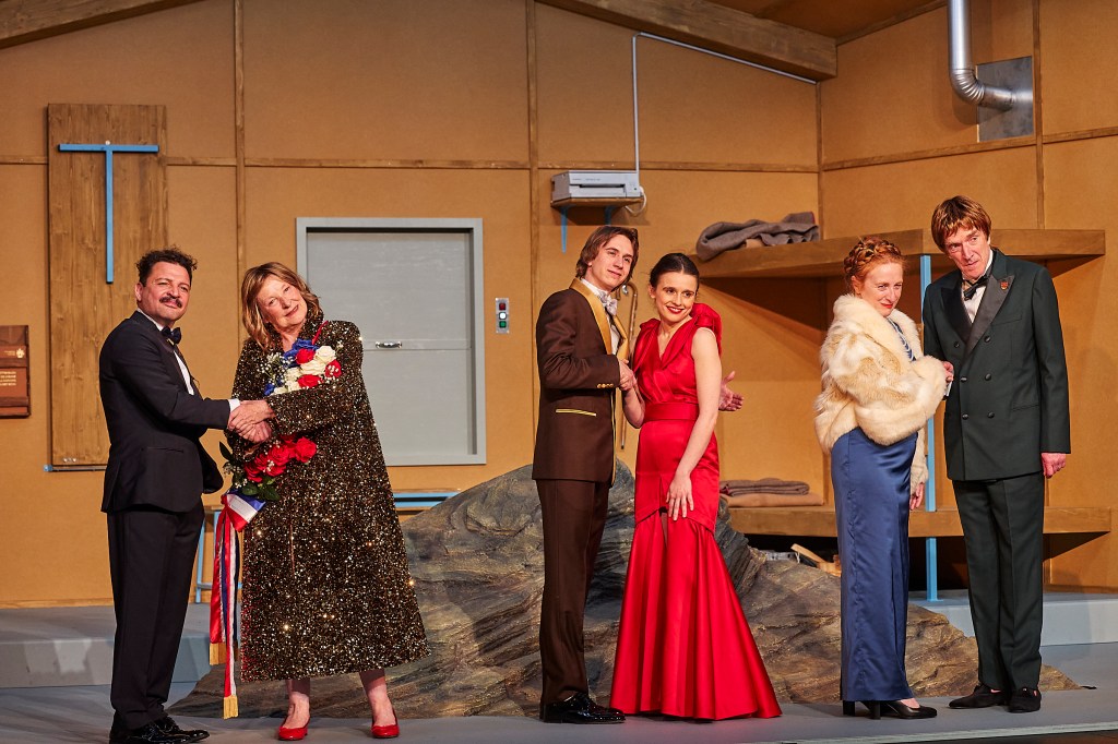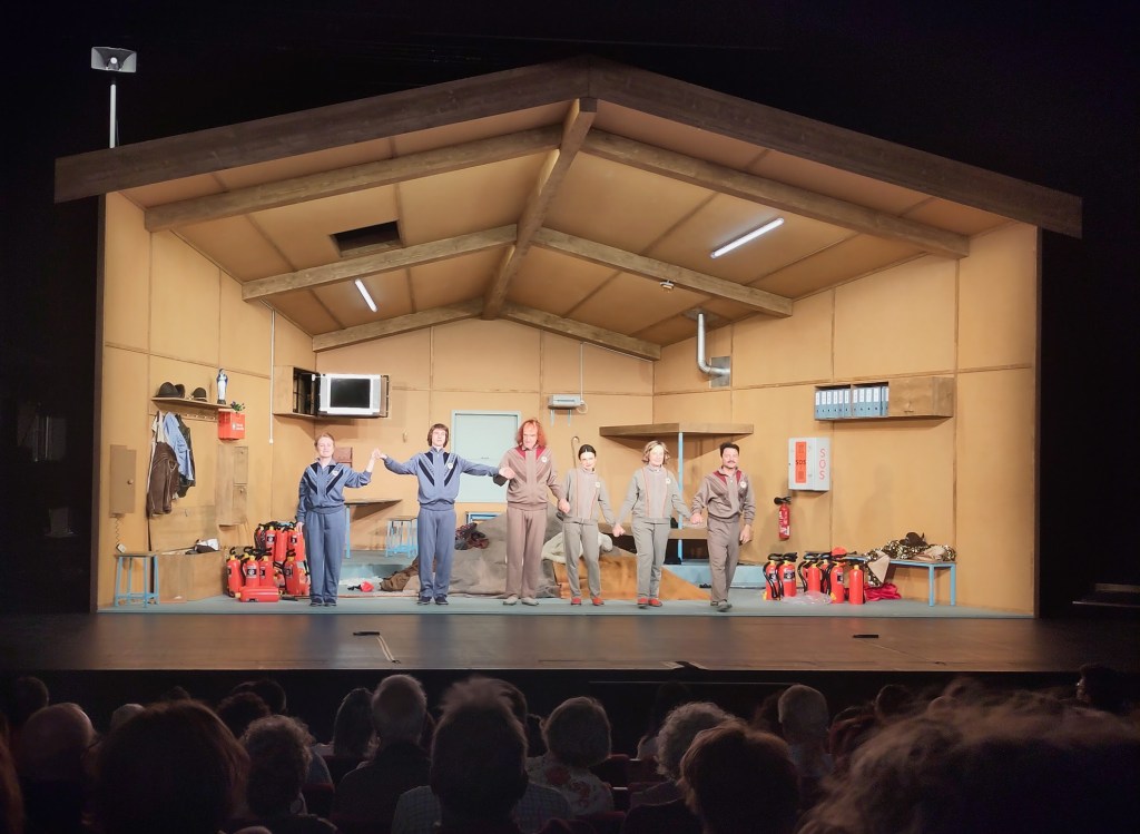 On embarque alors pour ce lieu culminant où règne l’absurde. Une partition de « oui-si-ja-but-yes… » est décryptée par le groupe sur classeurs individuels, un QCR insensé ne les étonne pas, la température s’élève et le chalet devient sauna, les passages d’hélicoptère font enfler l’inquiétude, iels se pomponnent pour une séance photo improvisée, un discours assourdi s’adresse à un public qui n’y entend goutte, des chants choraux installent enfin des cohésions, un laïus rythmé sur joues est parfaitement entendu et compris d’elleux seul.e.s, un télex crache un long message qui les rend hilares, on se déchaîne dans une séance de gym à bâtons de ski rompus, des extincteurs qui n’éteindront rien car gonflables leur tombent dessus, les toilettes s’effondrent et le livre d’or de la cabane dévoile d’archaïques et insondables merveilles ( » le temps infini comme un bruissement se sert de moi« ).