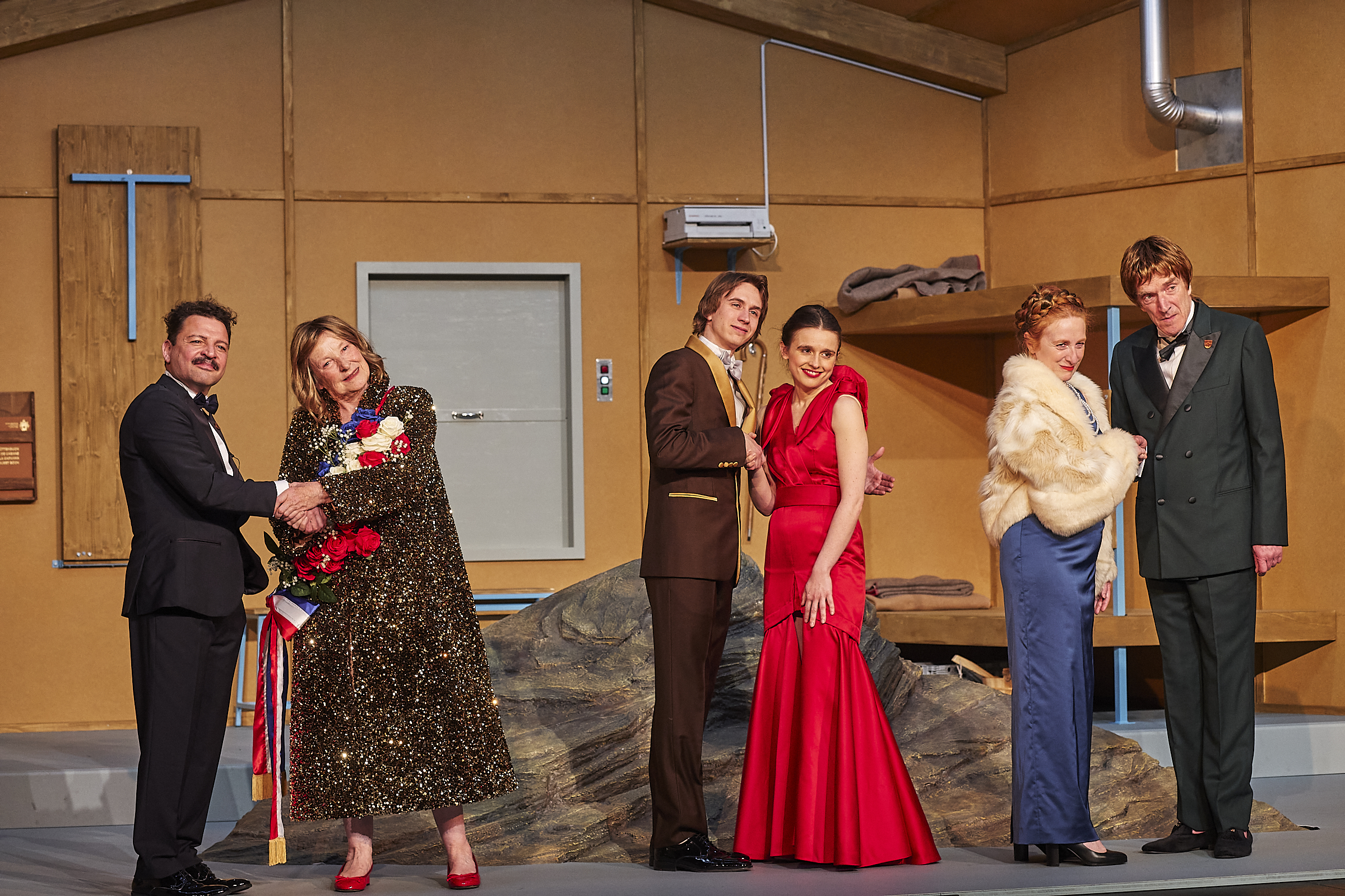 Un sommet de six personnes dans un chalet, voilà un pitch plutôt sommaire, mais pour qui a déjà consommé du Marthaler, on peut s’attendre à tout un plat à partir de cela. D’ailleurs, les protagonistes débarquent par le monte-plats!