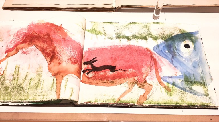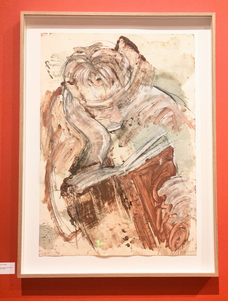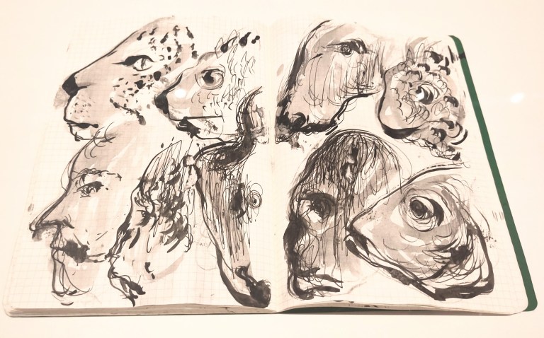 L’exposition se passe de tout texte, exceptés le titrage et le datage des oeuvres. Elle n’est pas chronologique, mais s’attache aux productions en lien avec le livre et la littérature. Le premier étage montre dessins, peintures et carnets, ces derniers au nombre de plus de 300, relatent en particulier ses voyages en Afrique. On y voit aussi une série de céramiques.