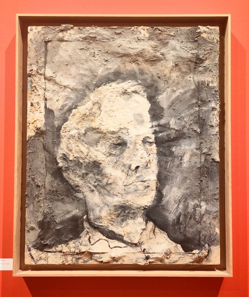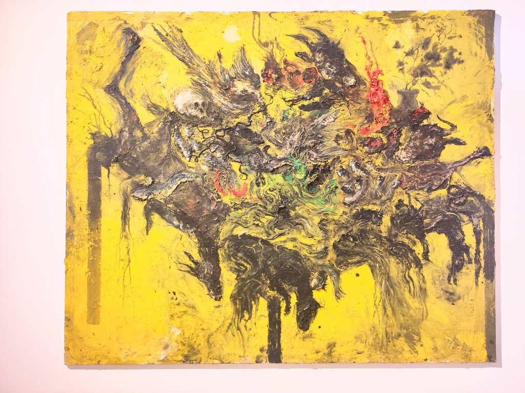 Un saisissant portrait de l’écrivain Paul Bowles, ami de l’artiste. Juste avant la parution de son livre évènement « Un thé au Sahara« , Paul Bowles rencontre Miquel Barcelò à Tanger en 1990. Il s’en suivra une correspondance de longue haleine. Publié en 2010, le récit de Bowles, « La boucle du Niger« , son dernier, est illustré par Barcelò, lui-même étant l’inspiration de l’un des personnages de ce livre. (video Bowles à Tanger). Le portrait ci-dessus est composé de vinyle, pigments, fusain et collage sur toile. Il s’apparente presque à un bas-relief.