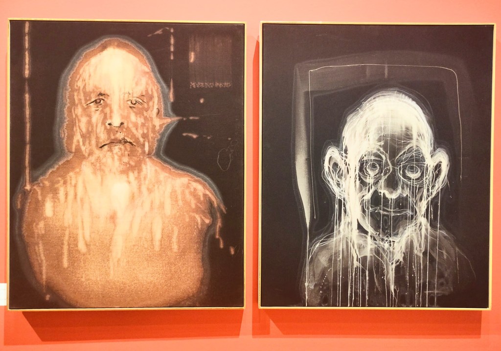 Ci-dessus, deux portraits façonnés à l’eau de javel sur toile et rehaussés de craie blanche et fusain. Cette technique offre à ces visages une dimension éthérée qui les apparente à des esprits jaillissant des ténèbres.