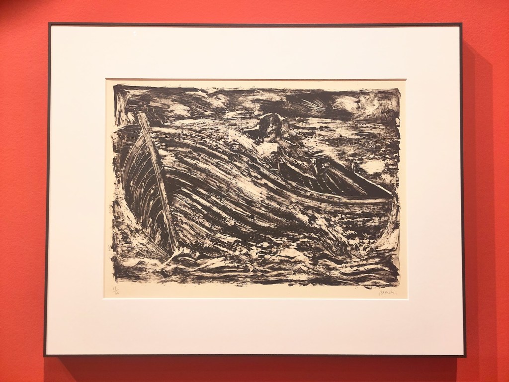 Deux lithographies de 1984 montrent sur l’une, le livre apparenté à un aquarium et des arêtes de poisson, sur l’autre un lecteur embarqué par sa lecture. pour moi, ces deux oeuvres décrivent efficacement à quel point nous sommes plongés au coeur d’une littérature qui nous passionne.