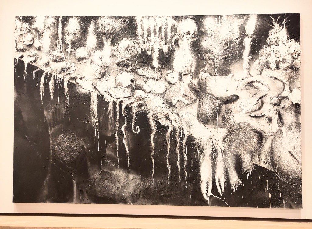 La salle inférieure continue l’exploration de l’oeuvre avec trois tableaux monumentaux et quelques bronzes. « Le banquet avec Poe » (2022, vinyle, pigments, encre et fusain sur toile) est particulièrement saisissant. D’une dextérité remarquable, ce focus sur un segment de table de festin, éclairé aux candélabres, parsemé de crânes et de chevelures, évoquant aussi Maupassant ou Baudelaire, dépeint avec brio une ambiance sépulcrale mise en lumière par l’écrivain et ses sombres réflexions sur la nature humaine.