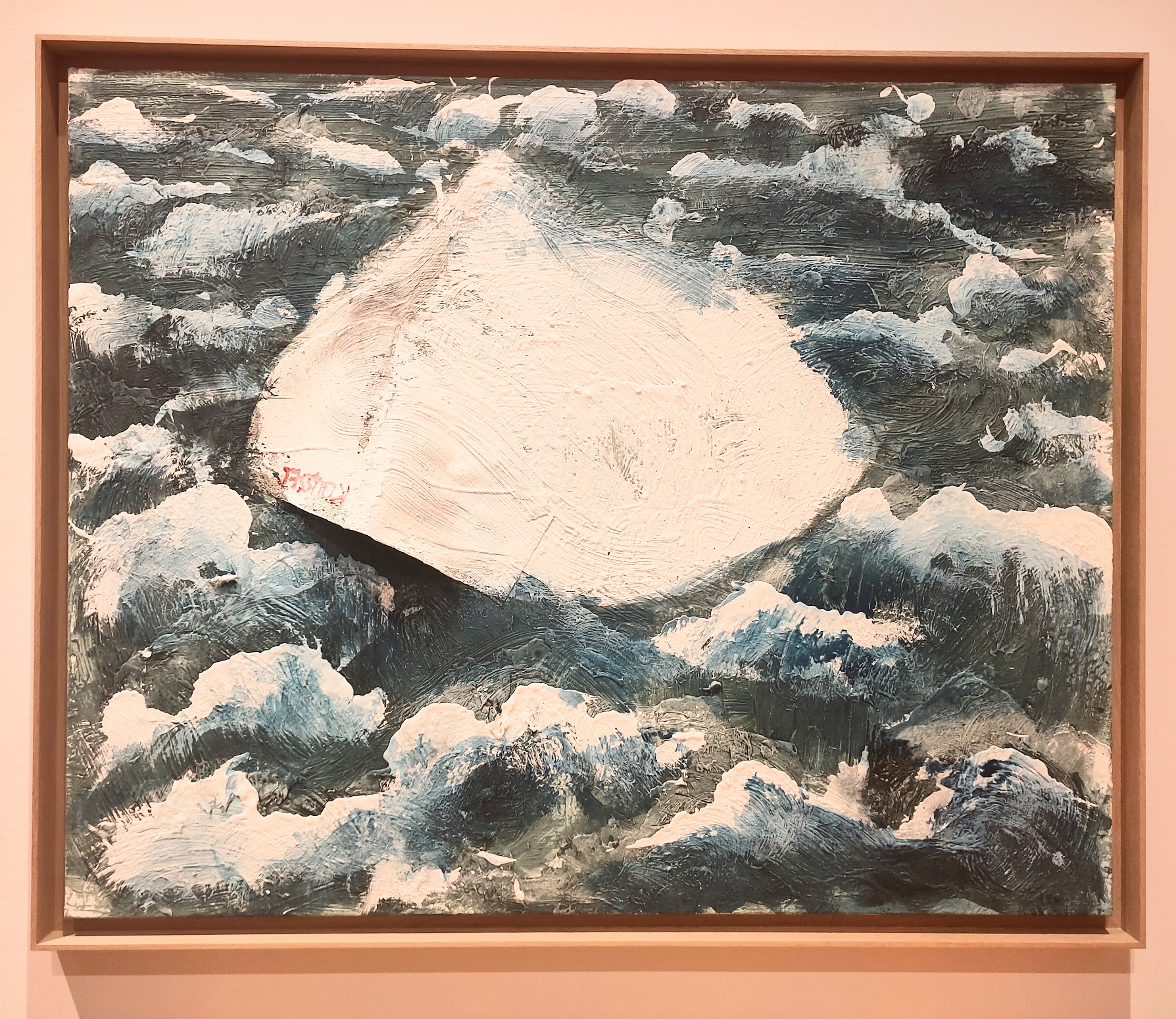 « Une de mes passions, c’est Raymond Roussel [1877-1933]. Impressions d’Afrique [1909], c’est plus proche de la peinture que de la littérature. La phrase est plastique. » (ITW le Monde, 2021) Voilà une citation de Miquel Barcelò qui rejoint la vision de Marcel Duchamp (il est partout!) au sujet de Raymond Roussel (1877-1933). Il inscrit son patronyme à l’envers sur cette toile représentant une sorte de coquille d’oeuf flottant sur une mer moutonneuse. L’esquif s’est renversé (en relief) et semble avaler les remous environnants, comme s’il laissait entendre que l’oeuvre de Roussel en est constituée.