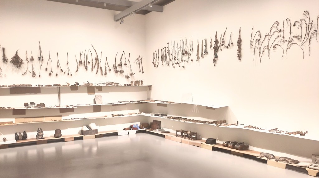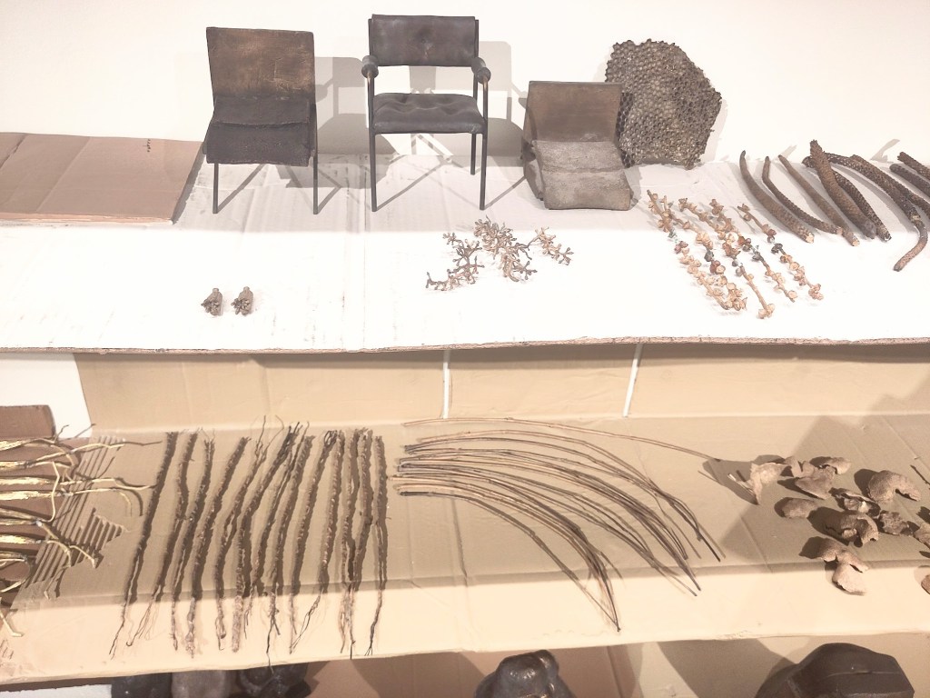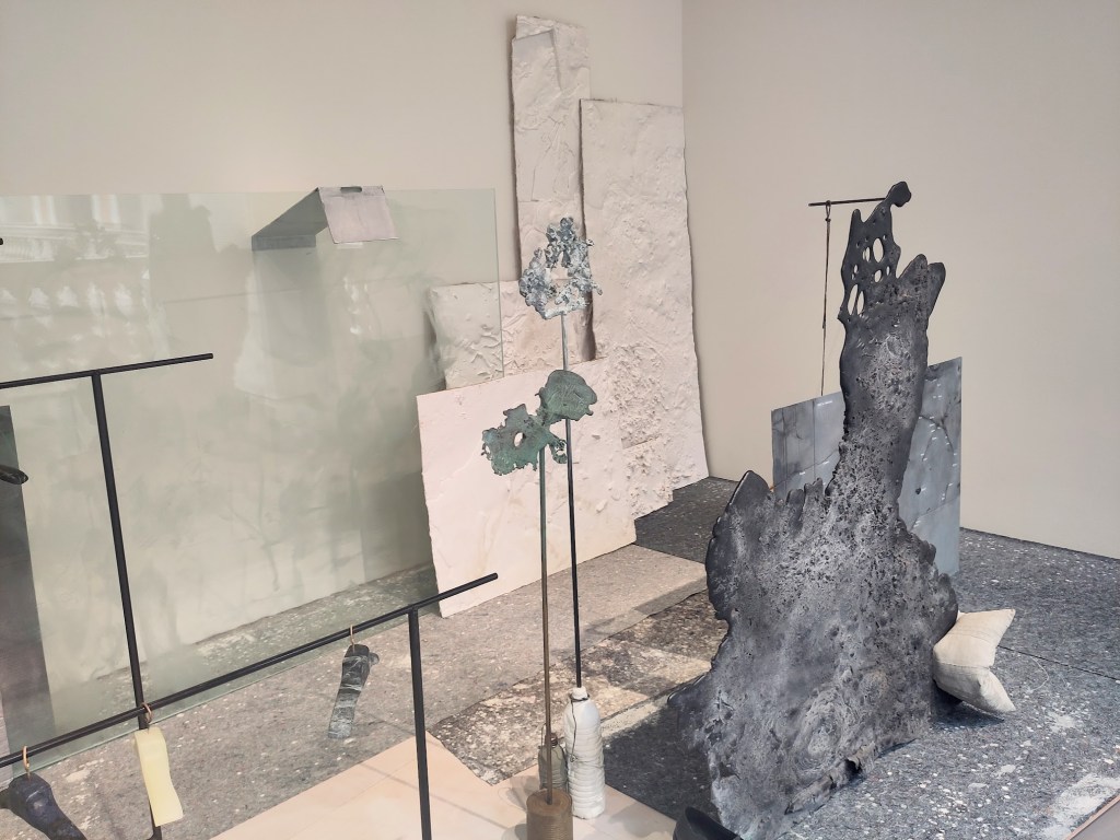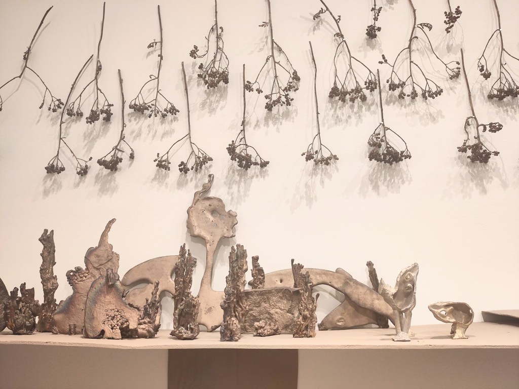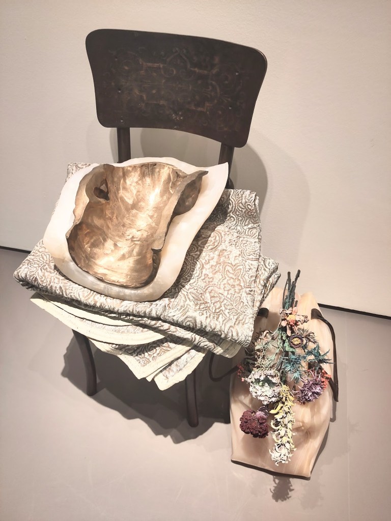 L’univers mystérieux de cette artiste, doublé de ses différentes techniques, laissant la place aux imaginaires de chacun.e, est pour moi une fascination absolue. Je trouve captivant l’esthétique de son travail sur la mémoire et sa conservation, balançant entre psychisme, concept et matérialité. Futur improbable et impressions du passé se mêlent en un présent artistique intense, malgré une première impression de froideur. Au fait, je n’ai pas montré ses bijoux, ceux qu’elle a inventé au fil de ses voyages. Ils affichent un vocabulaire différent et sont émouvants par la fragilité de leur aspect éphémère. Tout à l’inverse des objets de l’exposition, figés dans des matières nobles et quasiment indestructibles.