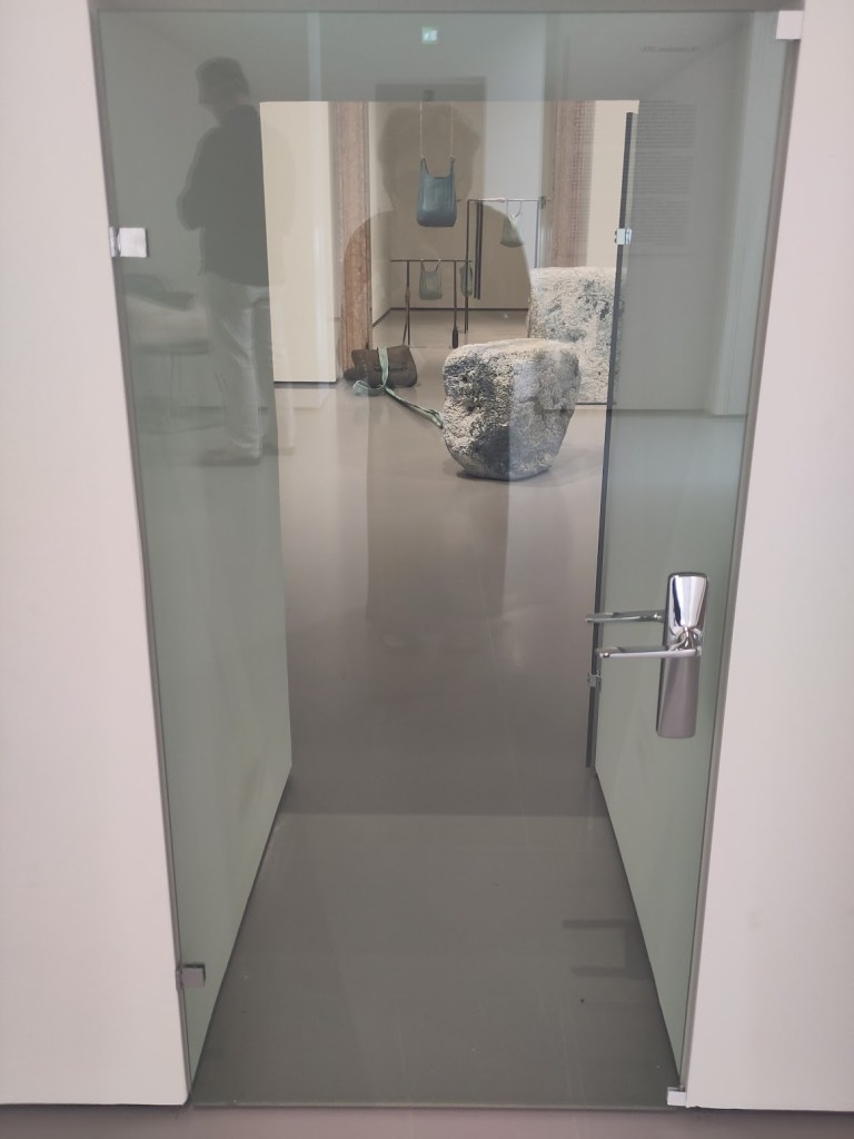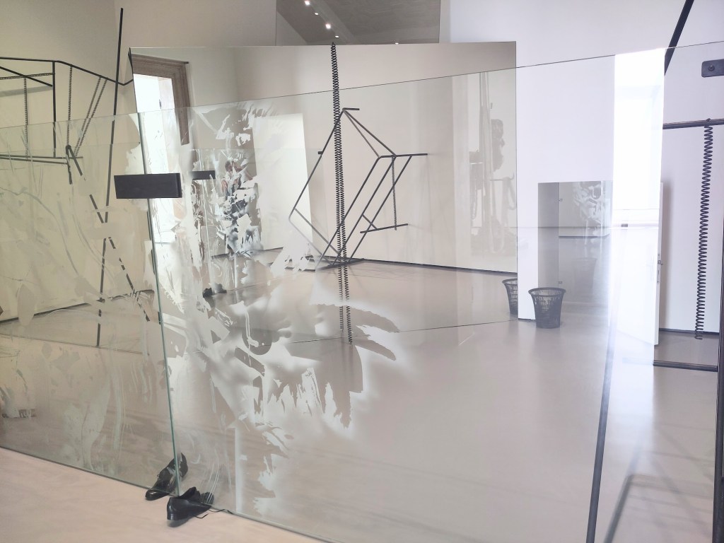 Les mondes intérieurs débordent sur les mondes extérieurs. Des vitres écrasent des chaussures, comme pour les empêcher d’avancer. Une minuscule porte transparente donne sur une salles dans laquelle nous ne pouvons pas entrer. Une structure métallique de lit est accrochée à la paroi. Des lacs de fonte verticaux côtoient une carte des « Villes Invisibles » d’Italo Calvino.
