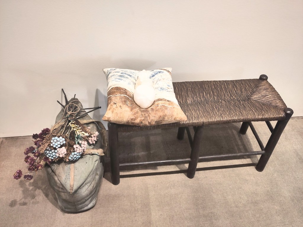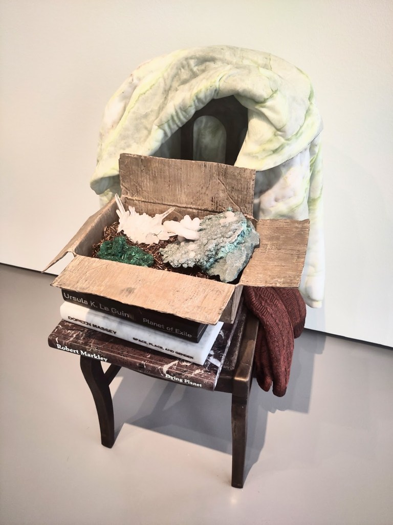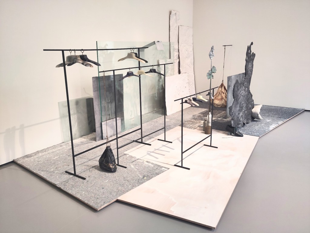 Les installations rencontrées sont des systèmes qui s’organisent et se complètent. Ce sont les regardeur.euses qui créent l’oeuvre, on ne peut mieux dire. Nous sommes confrontés à des univers insolubles qui nous rappellent vaguement quelque chose. Des amas de déchets, des abris de cartons et des couvertures, plus vraies que nature et pourtant moulées dans le bronze ou l’aluminium, des portants auxquels sont suspendus des cintres en marbre, autant d’objets banals, usés, qui évoquent une présence, une élaboration humaine, autant de récits à imaginer. Et toujours, une beauté étrange, calculée, telle une cartographie d’endroits rêvés dont nous devons inventer les codes.