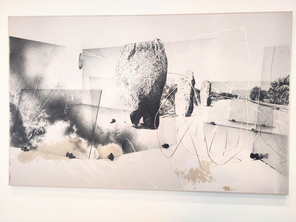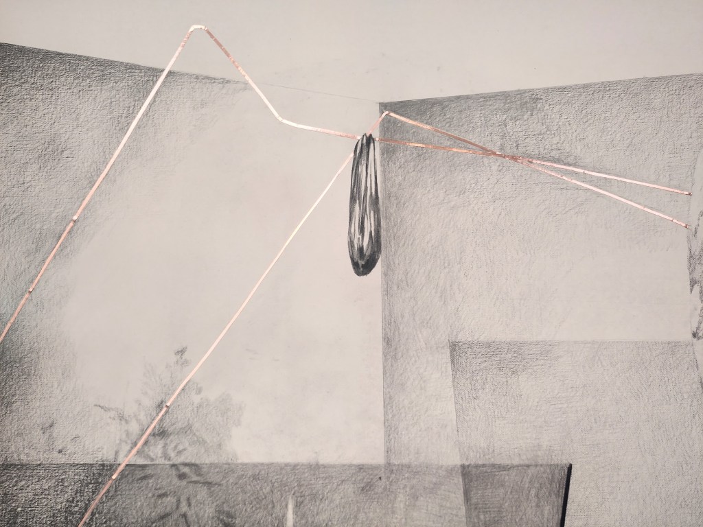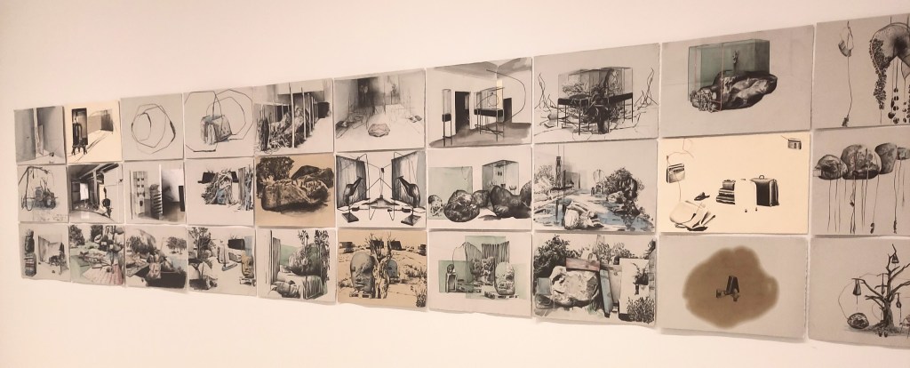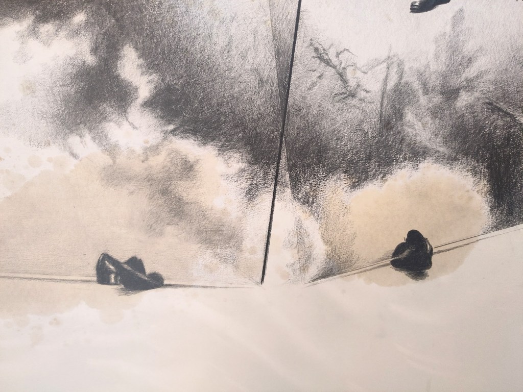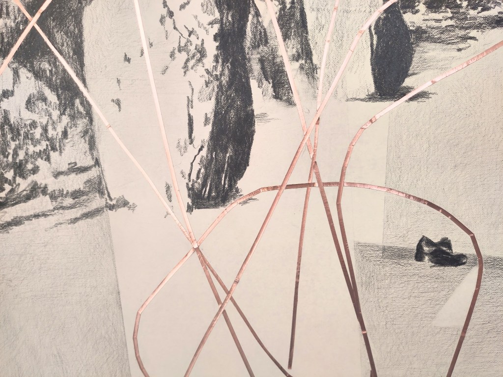 Tatiana trouvé dessine. Elle passe de deux à trois dimensions, sans omettre la quatrième, dévolue à l’imagination des regardeur.euses, que ce soit dans ce sens ou inversement. Les dessins font écho aux oeuvres exposées au premier étage, replacées dans d’autres contextes. Les chaussures, symboles de déplacement. La série « Intranquillity », commencée en 2005, est inspirée du monumental « Livre de l’Intranquillité » de Fernando Pessoa. Des paysages intérieurs qui semblent bien rangés, mais desquels ressortent comme un fracas indistinct, une confusion à peine perceptible.