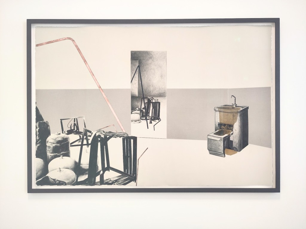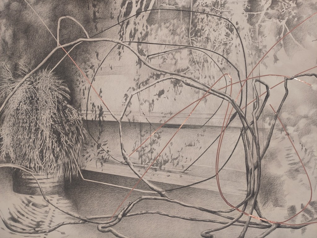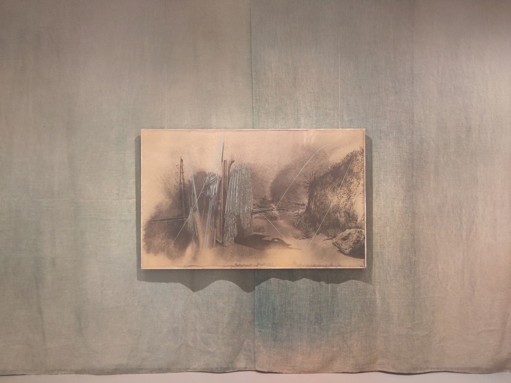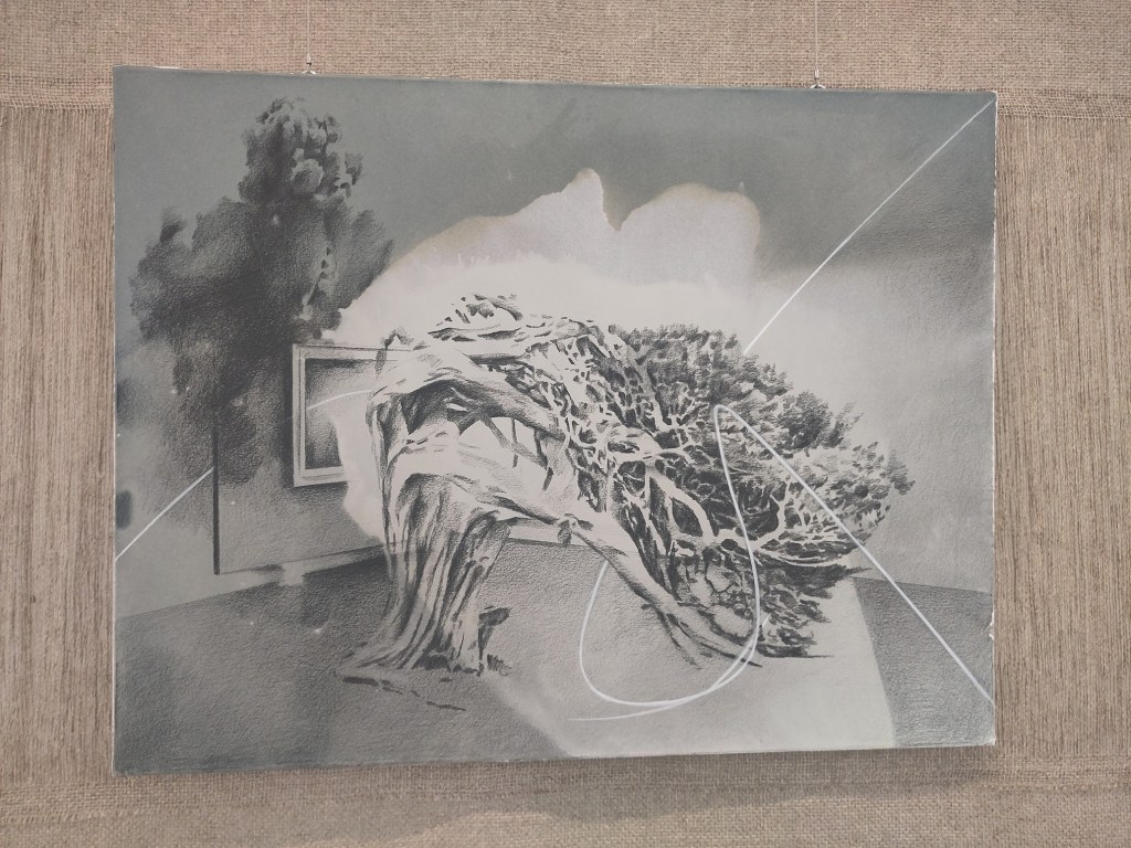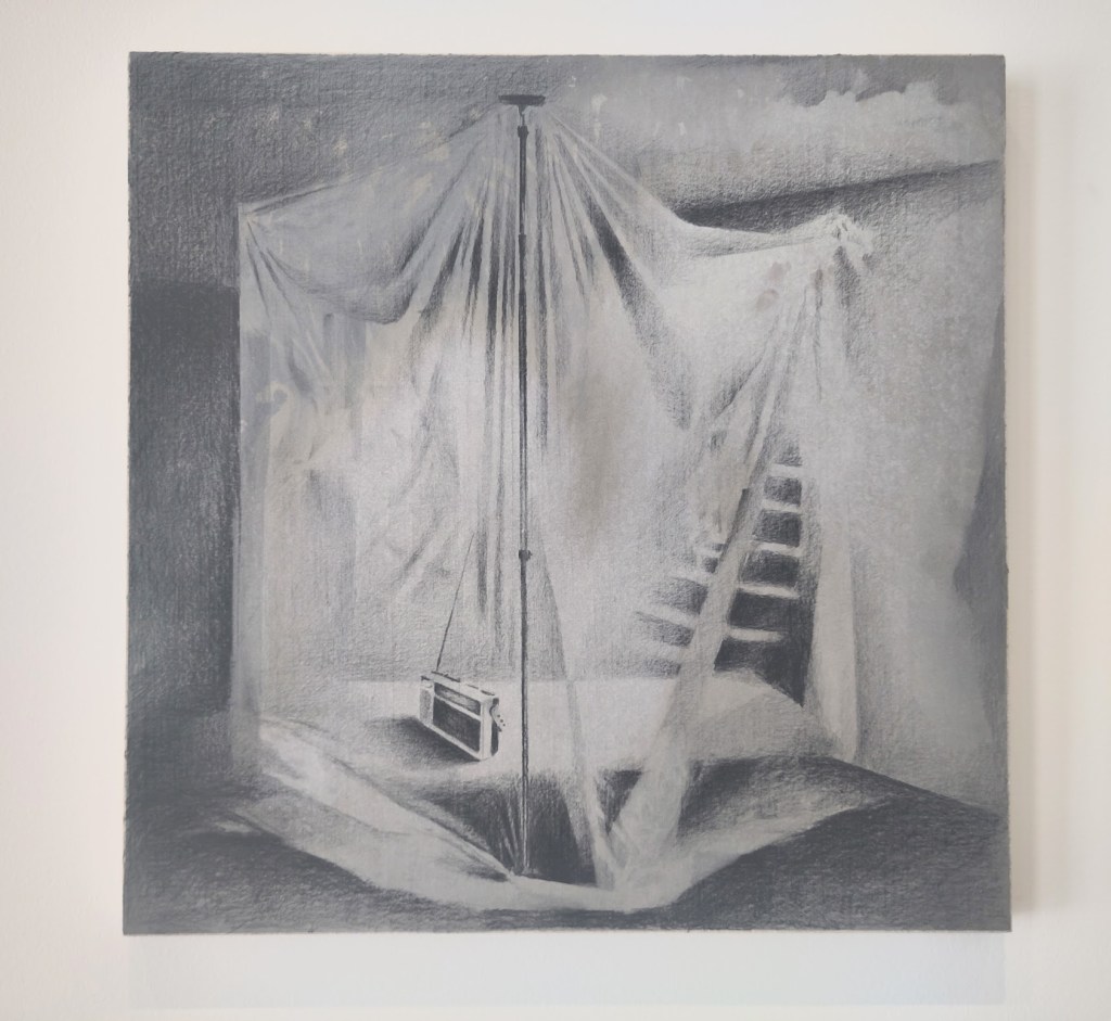 Tatiana trouvé dessine. Elle passe de deux à trois dimensions, sans omettre la quatrième, dévolue à l’imagination des regardeur.euses, que ce soit dans ce sens ou inversement. Les dessins font écho aux oeuvres exposées au premier étage, replacées dans d’autres contextes. Les chaussures, symboles de déplacement. La série « Intranquillity », commencée en 2005, est inspirée du monumental « Livre de l’Intranquillité » de Fernando Pessoa. Des paysages intérieurs qui semblent bien rangés, mais desquels ressortent comme un fracas indistinct, une confusion à peine perceptible.