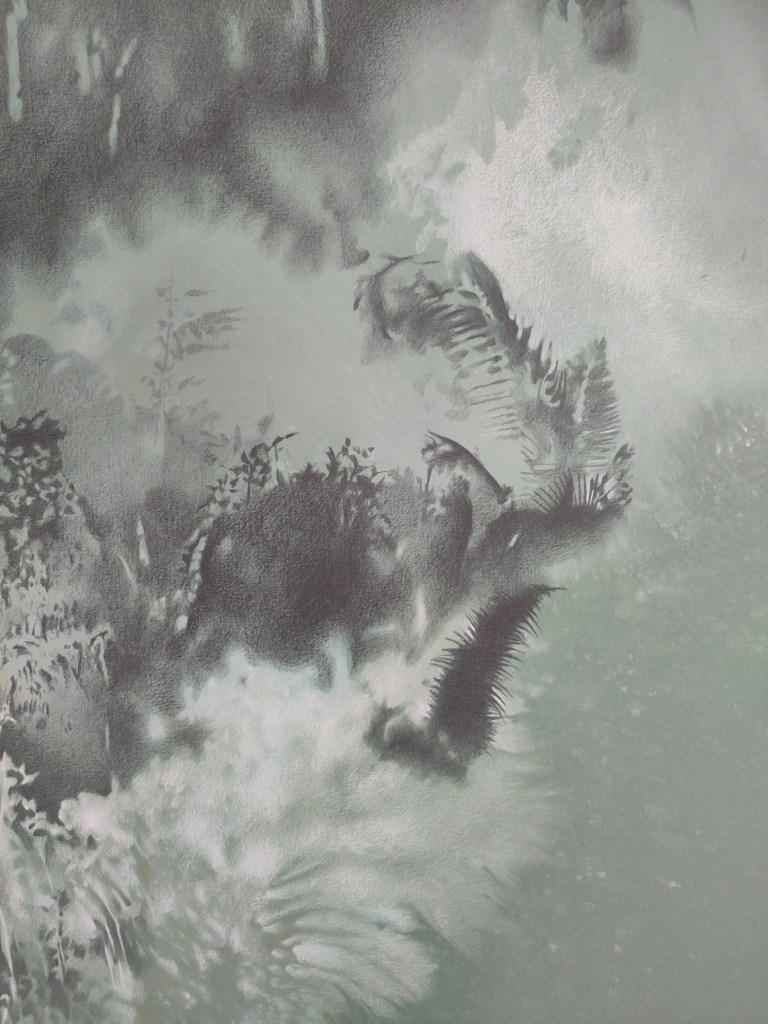 Crayons de couleur et eau de javel sur papier marouflé sur toile, cette oeuvre sans titre de 2022 (260x400x5 cm) fait partie de la série « les Dessouvenus » (et non les oubliés).