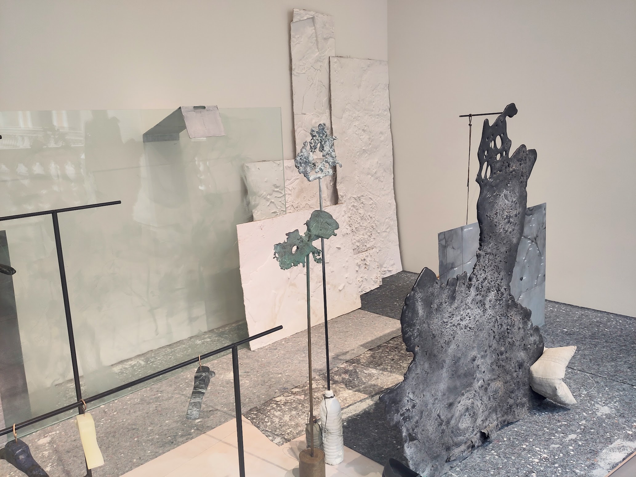 Les oeuvres mystérieuses et fascinantes, de Tatiana Trouvé (1968), son univers qui semble émaner de rêves incongrus, tout cela à découvrir sur les trois étages du palais Grassi dans un accrochage aéré et subtil. Le parcours labyrinthique est jalonné par la série The Gardians. Invisibles, leurs présences matérielles sont signalées par des sièges abandonnés, toutefois habités par des effets personnels: coussins, chaussures, sacs, livres, couvertures, bouquets, radios, clés, autant d’objets personnels liés au repos, aux moments de liberté, à quelque chose de douillet. Et pourtant tout est moulé, sculpté dans le marbre ou le laiton, peint en trompe-l’oeil, onyx et malachite le disputant au bronze, à l’acier ou au cuivre. Les corps absents du gardien ou de la gardienne paraissent plus incarnés que s’ils étaient vraiment là. Iels restent muets mais parlent avec leurs traces. Tatiana Trouvé a occupé cet emploi de gardienne de musée dans ses jeunes années.