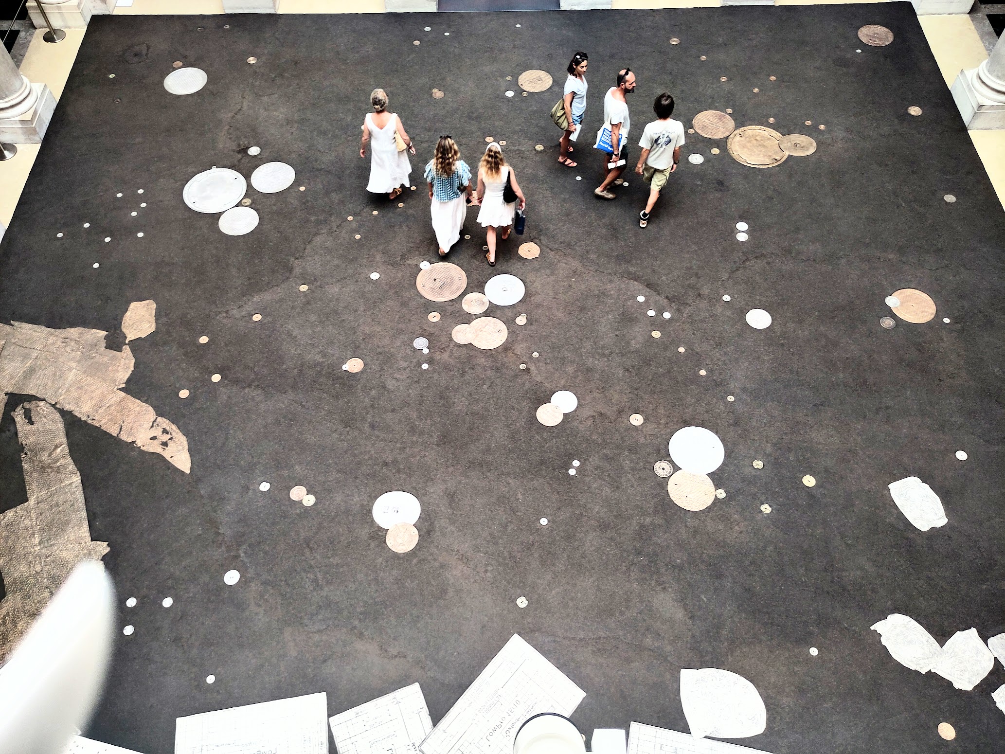 Le hall d’entrée est investi par l’artiste: un sol asphalté criblé de plaques d’égout provenant du monde entier, une sorte de convergence de l’eau comme de la marche des visiteurs. Vu du dessus, cela donne une image cosmique, des constellations immédiatement reliées au ciel et à l’espace par notre mental. L’asphalte, depuis des siècles, protège les piétons de l’humidité du sol. (« Hors-sol », 2025)