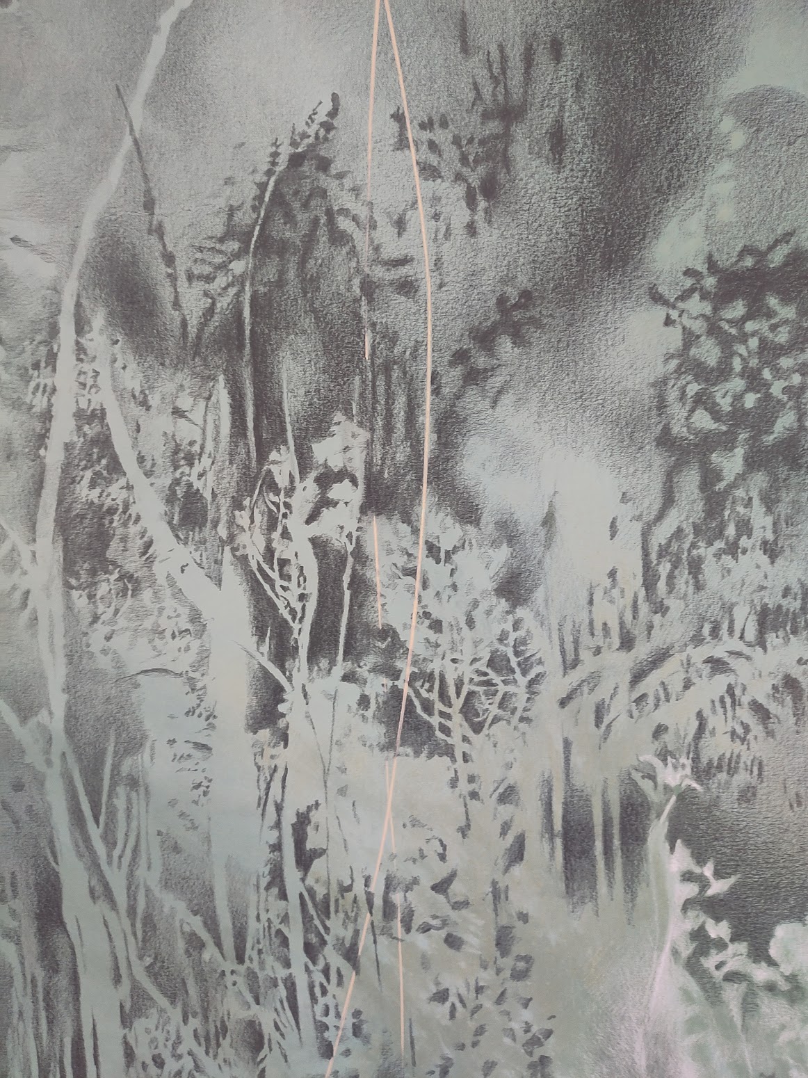 Crayons de couleur et eau de javel sur papier marouflé sur toile, cette oeuvre sans titre de 2022 (260x400x5 cm) fait partie de la série « les Dessouvenus » (et non les oubliés).