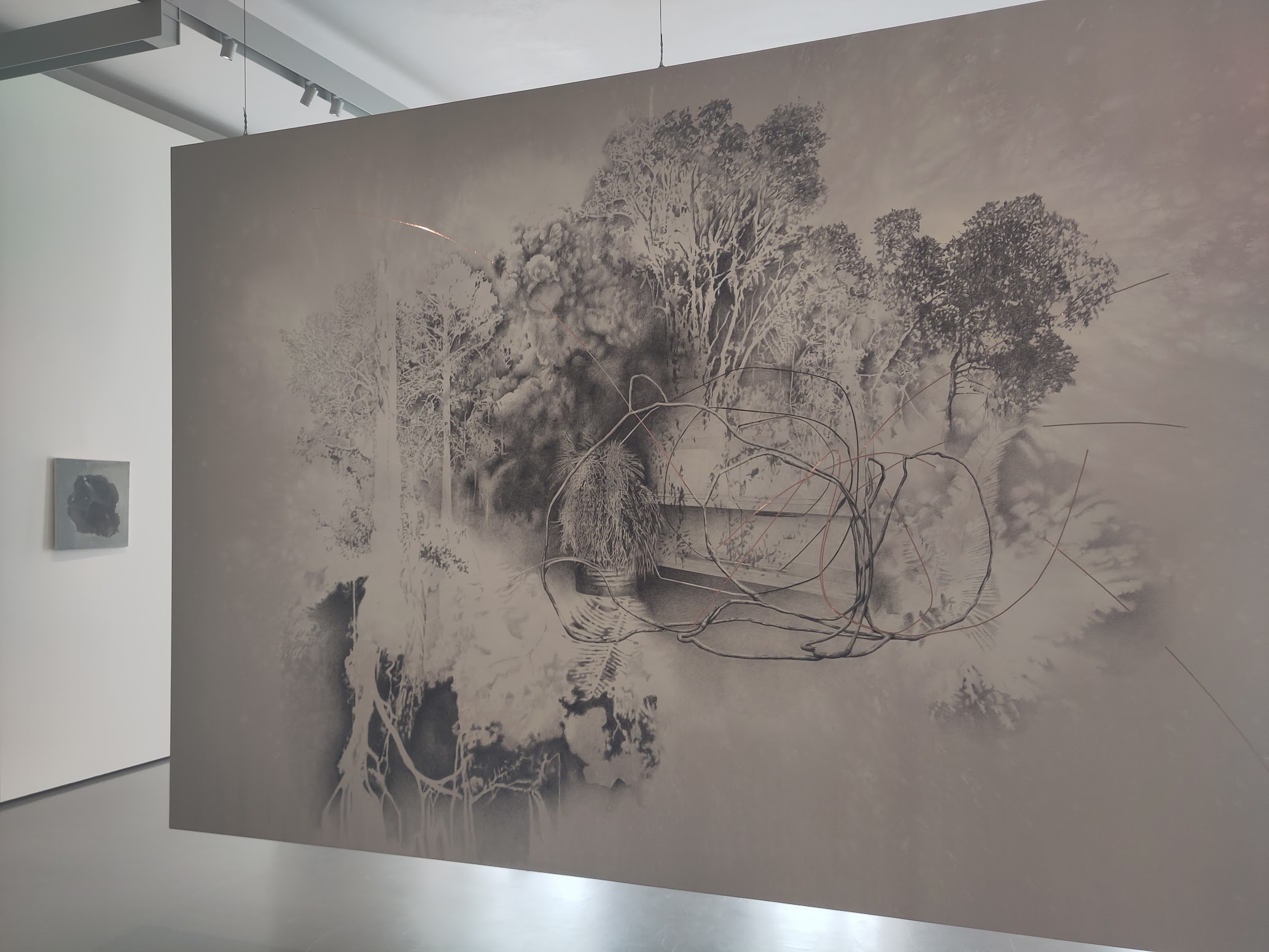 Il faut dire un mot sur l’accrochage, évidemment travaillé avec l’artiste, magnifiquement dressé. La lumière diffuse de certaine salle. Les tentures et les sols quelquefois combinant un écrin pour des toiles monumentales. Les suspensions permettant des rectos/versos époustouflants.