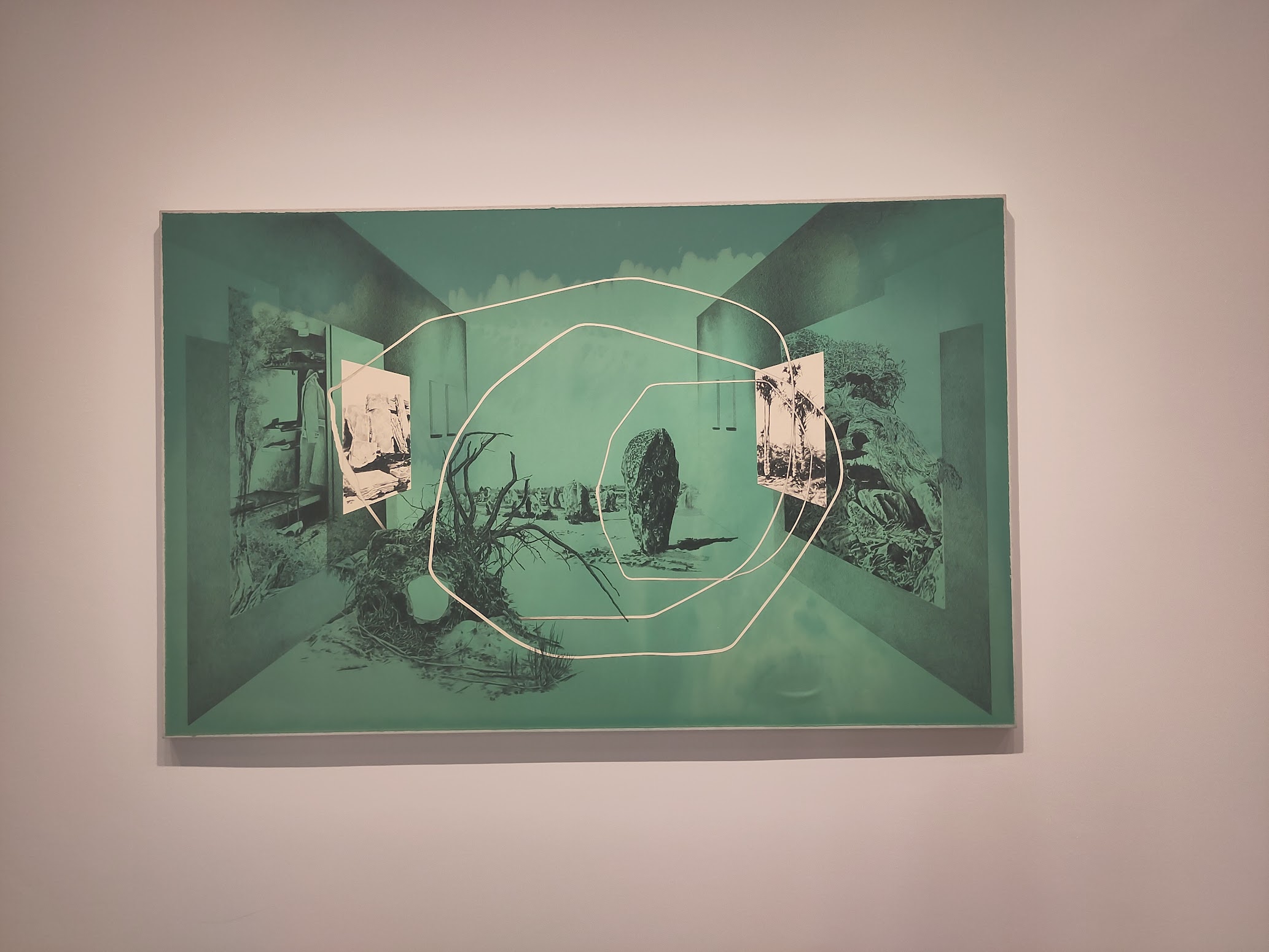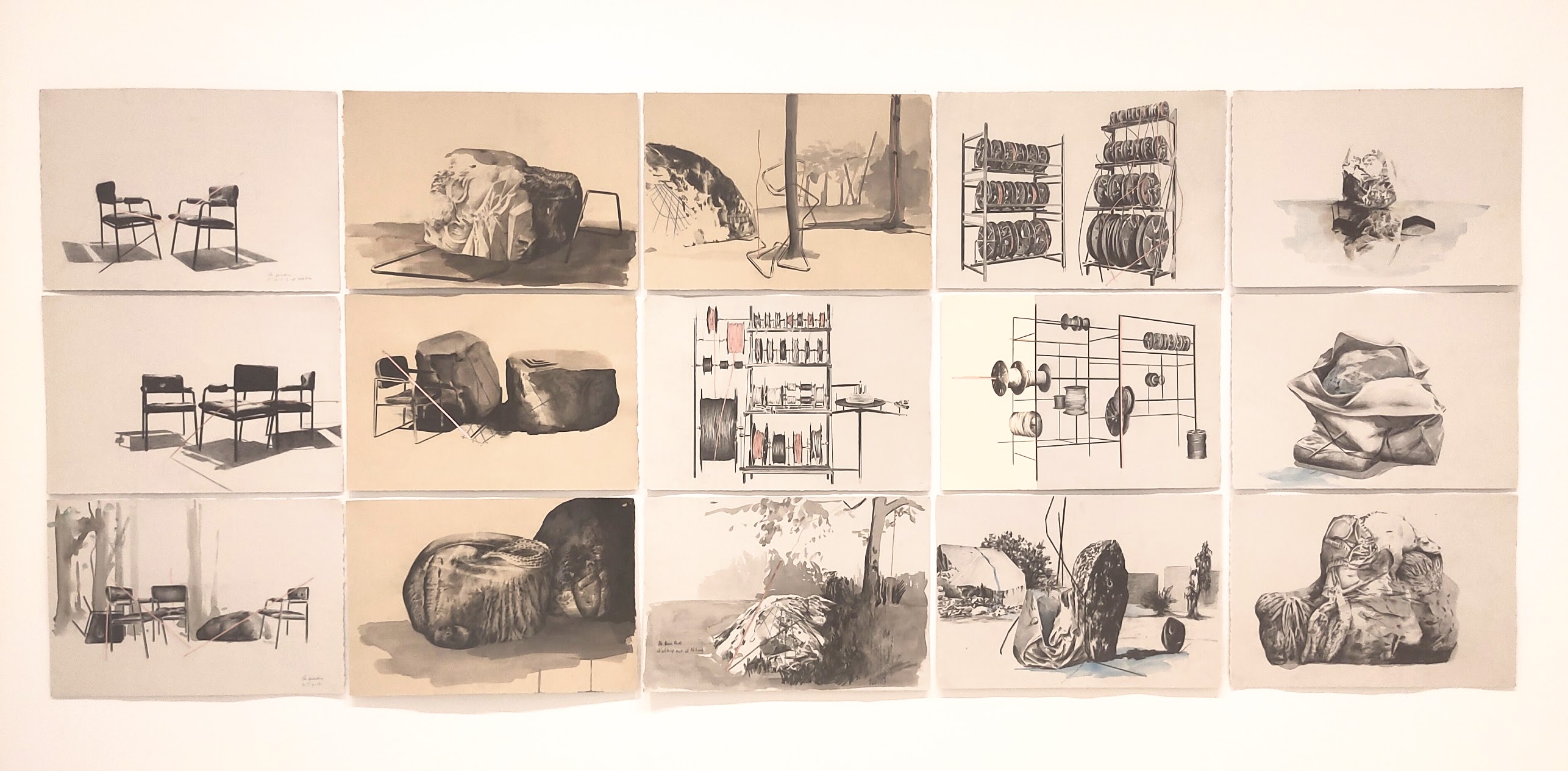 Tatiana trouvé dessine. Elle passe de deux à trois dimensions, sans omettre la quatrième, dévolue à l’imagination des regardeur.euses, que ce soit dans ce sens ou inversement. Les dessins font écho aux oeuvres exposées au premier étage, replacées dans d’autres contextes. Les chaussures, symboles de déplacement. La série « Intranquillity », commencée en 2005, est inspirée du monumental « Livre de l’Intranquillité » de Fernando Pessoa. Des paysages intérieurs qui semblent bien rangés, mais desquels ressortent comme un fracas indistinct, une confusion à peine perceptible.