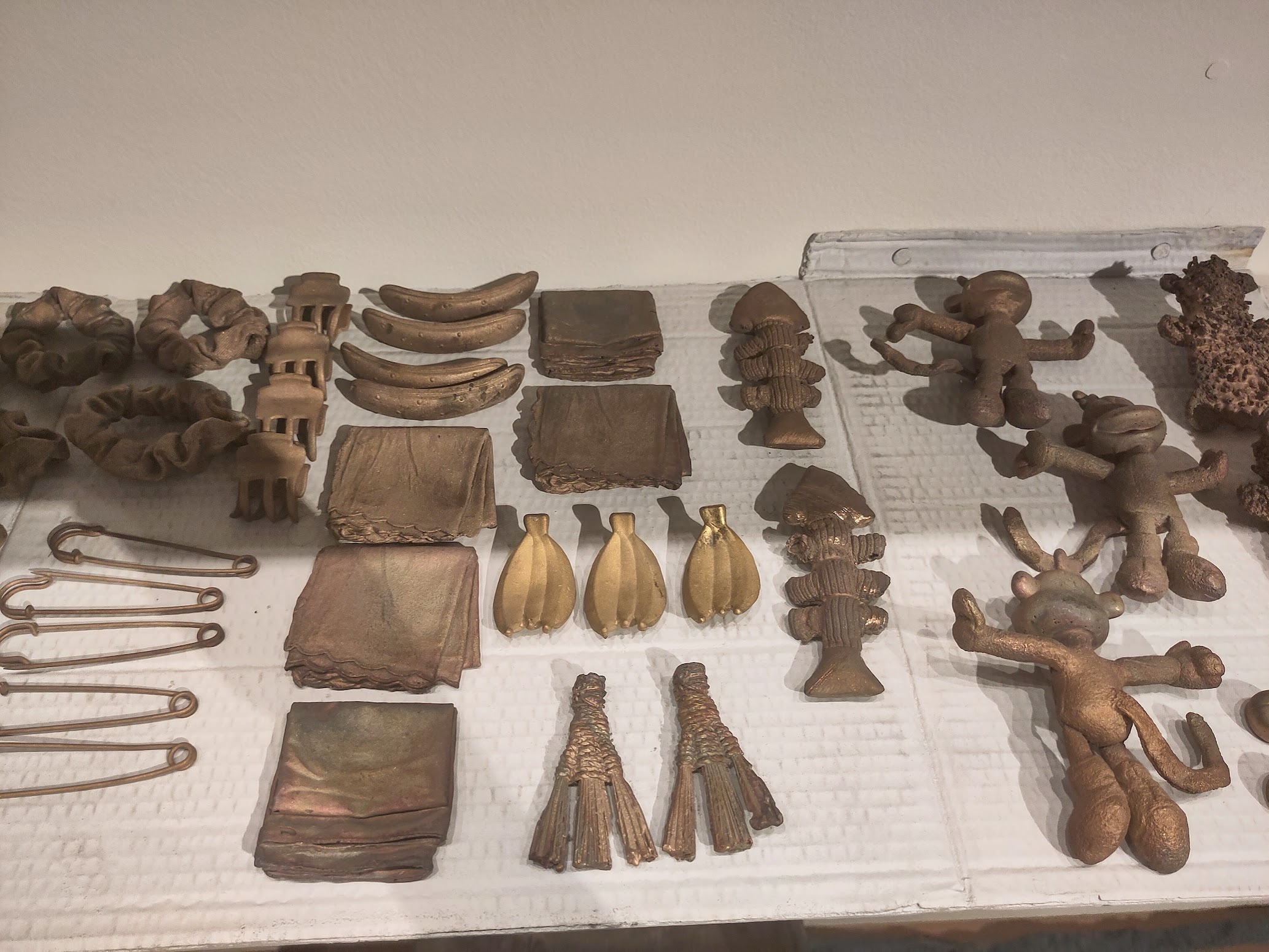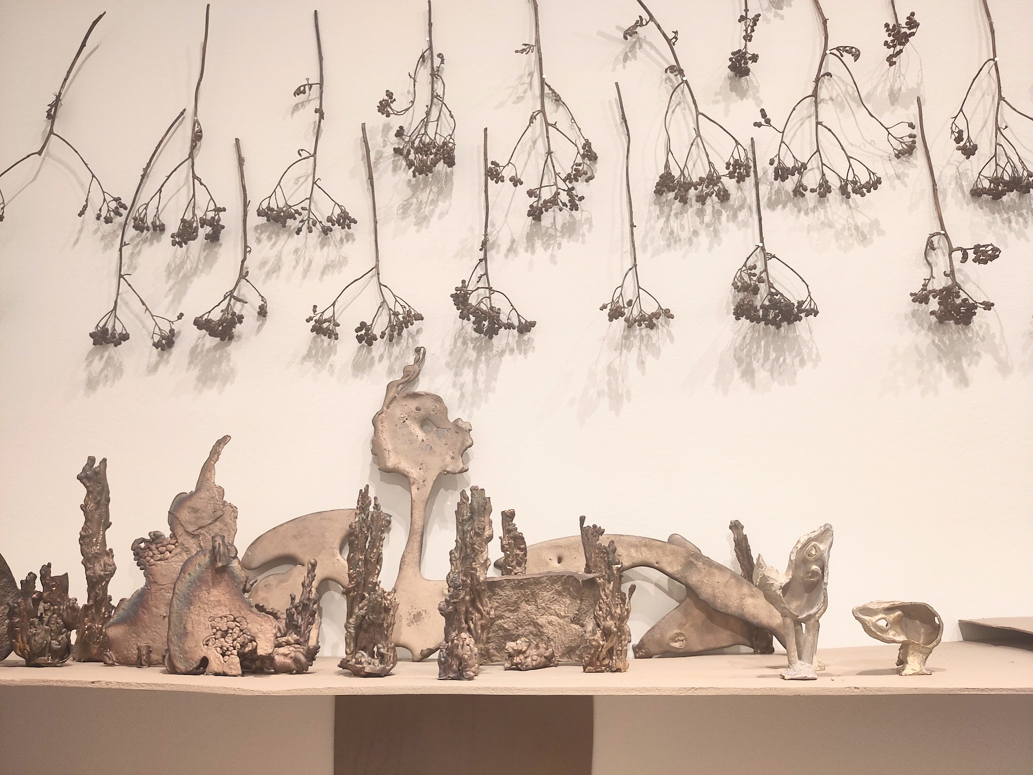 L’univers mystérieux de cette artiste, doublé de ses différentes techniques, laissant la place aux imaginaires de chacun.e, est pour moi une fascination absolue. Je trouve captivant l’esthétique de son travail sur la mémoire et sa conservation, balançant entre psychisme, concept et matérialité. Futur improbable et impressions du passé se mêlent en un présent artistique intense, malgré une première impression de froideur. Au fait, je n’ai pas montré ses bijoux, ceux qu’elle a inventé au fil de ses voyages. Ils affichent un vocabulaire différent et sont émouvants par la fragilité de leur aspect éphémère. Tout à l’inverse des objets de l’exposition, figés dans des matières nobles et quasiment indestructibles.