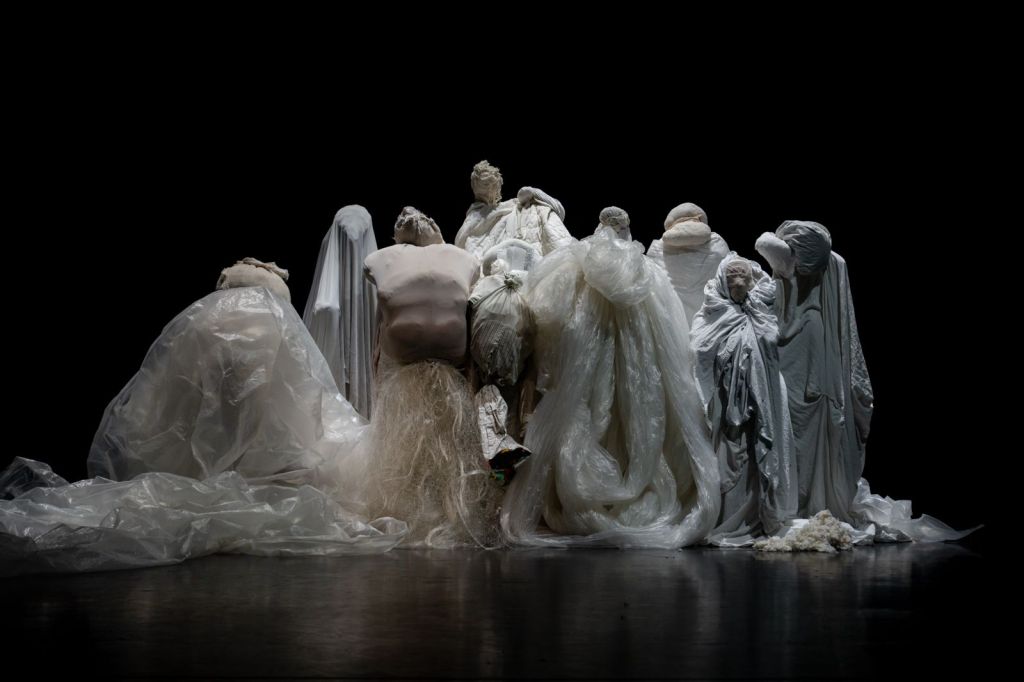 De ces silencieuses métamorphoses, quelques chuchotements émergent qui tournent aux petits cris et paroles indistinctes, ou en bribes de chants. Mais le mouvement, le flux, la houle ne s’éteint pas, le roulement semble même s’accélérer, des choses jetées éclaboussent la vague, des mains surgissent de cette écume, un tempo sourd commence à rythmer le roulis et les corps émergent et s’habillent de couleurs. Bientôt, la musique s’amplifie de sonorités africaines. Après la sarabande, voici une bacchanale explosive, formant des noeuds humains de constructions improbables. Une alignée d’hommes portant des têtes (et des fessiers), un djinn gourmand se pavane sur ses multiples jambes, une créature dont on garnit les bras de tissus blancs s’offre des ailes d’ange immaculées (ou celles d’un majestueux condor?), nous entrons un peu plus encore dans un univers peuplé d’esprits fripons et délurés. Jusqu’à ce qu’iels mutent en majesté et deviennent rois et reines, sous leurs tiares scintillantes.