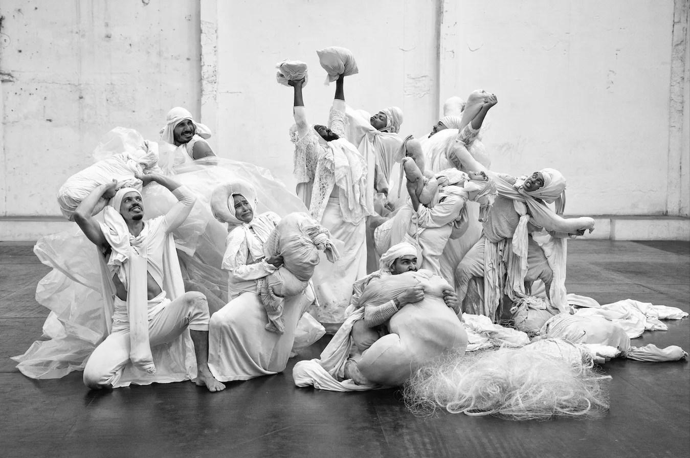 De ces silencieuses métamorphoses, quelques chuchotements émergent qui tournent aux petits cris et paroles indistinctes, ou en bribes de chants. Mais le mouvement, le flux, la houle ne s’éteint pas, le roulement semble même s’accélérer, des choses jetées éclaboussent la vague, des mains surgissent de cette écume, un tempo sourd commence à rythmer le roulis et les corps émergent et s’habillent de couleurs. Bientôt, la musique s’amplifie de sonorités africaines. Après la sarabande, voici une bacchanale explosive, formant des noeuds humains de constructions improbables. Une alignée d’hommes portant des têtes (et des fessiers), un djinn gourmand se pavane sur ses multiples jambes, une créature dont on garnit les bras de tissus blancs s’offre des ailes d’ange immaculées (ou celles d’un majestueux condor?), nous entrons un peu plus encore dans un univers peuplé d’esprits fripons et délurés. Jusqu’à ce qu’iels mutent en majesté et deviennent rois et reines, sous leurs tiares scintillantes.
