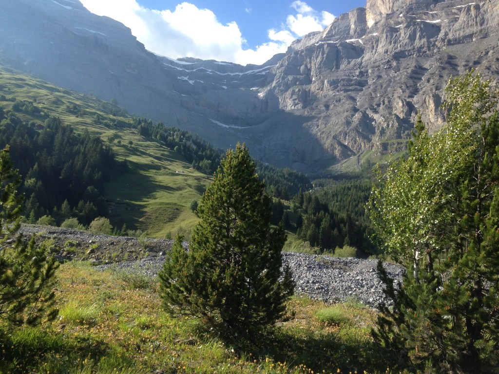 Tout à coup, la ligne du pâturage, qui s’affaisse dans son milieu, se met à tracer dans rien du tout sa courbe creuse. Et on voit qu’on est arrivé parce qu’un immense trou s’ouvre brusquement devant vous, étant de forme ovale, étant comme une vaste corbeille aux parois verticales, sur laquelle il faut se pencher, parce qu’on est soi-même à près de deux mille mètres et c’est cinq ou six cents mètres plus bas qu’est son fond. (Derborence, C-F. Ramuz, texte)