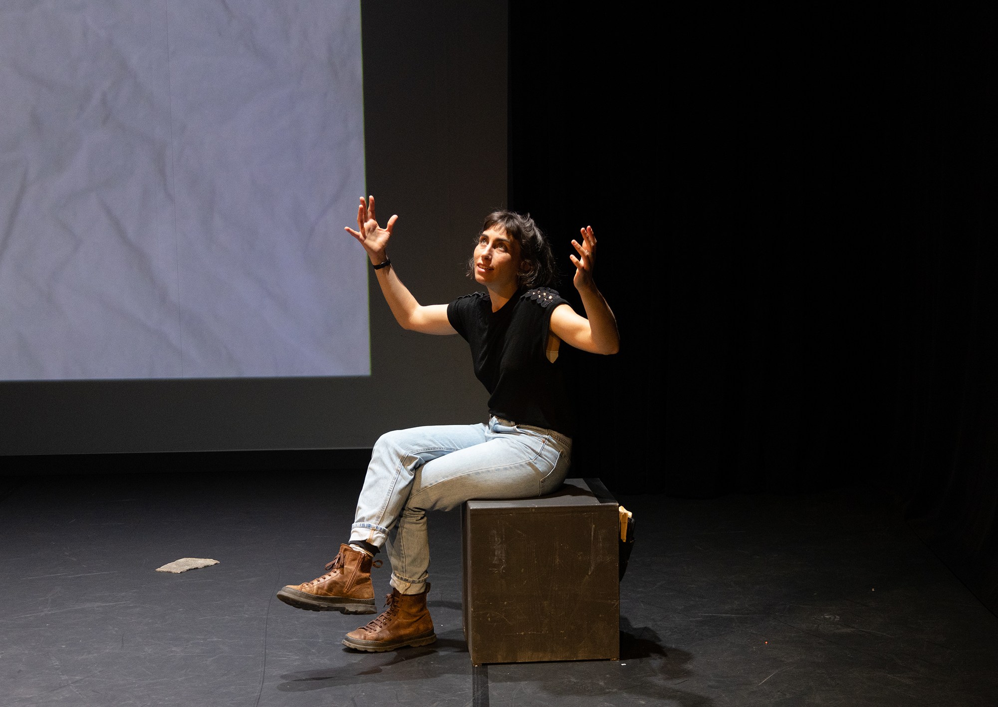 La pièce retrace donc les expériences effectuées en milieu naturel et celles du laboratoire. Mais c’est surtout la passion de la biologiste qui traverse la représentation. Elle partage avec le public le temps passé sur le terrain, les expériences d’extraction de l’ADN, et surtout ses propres émotions. Sa présence est puissante et son éloquence teintée d’un petit accent savoureux nous entraîne avec plaisir et intérêt dans les méandres de la route qui mène aux colonies fourmilières de Derborence.