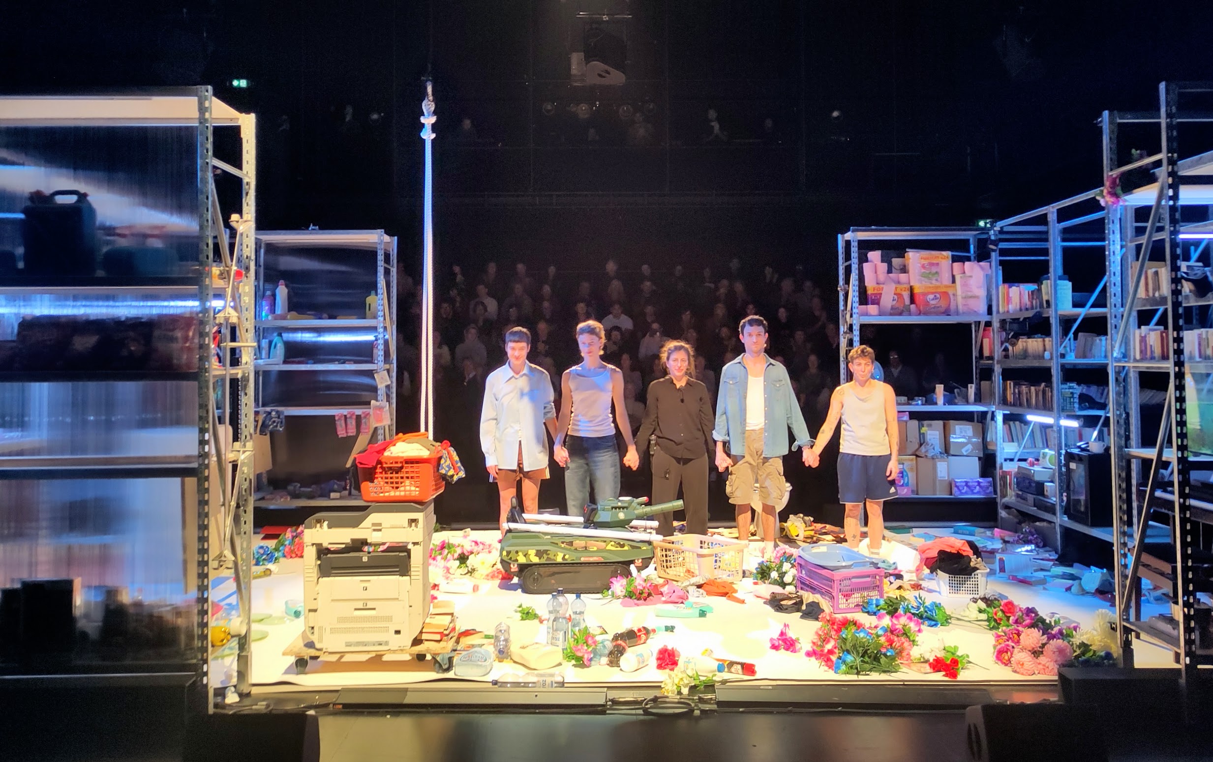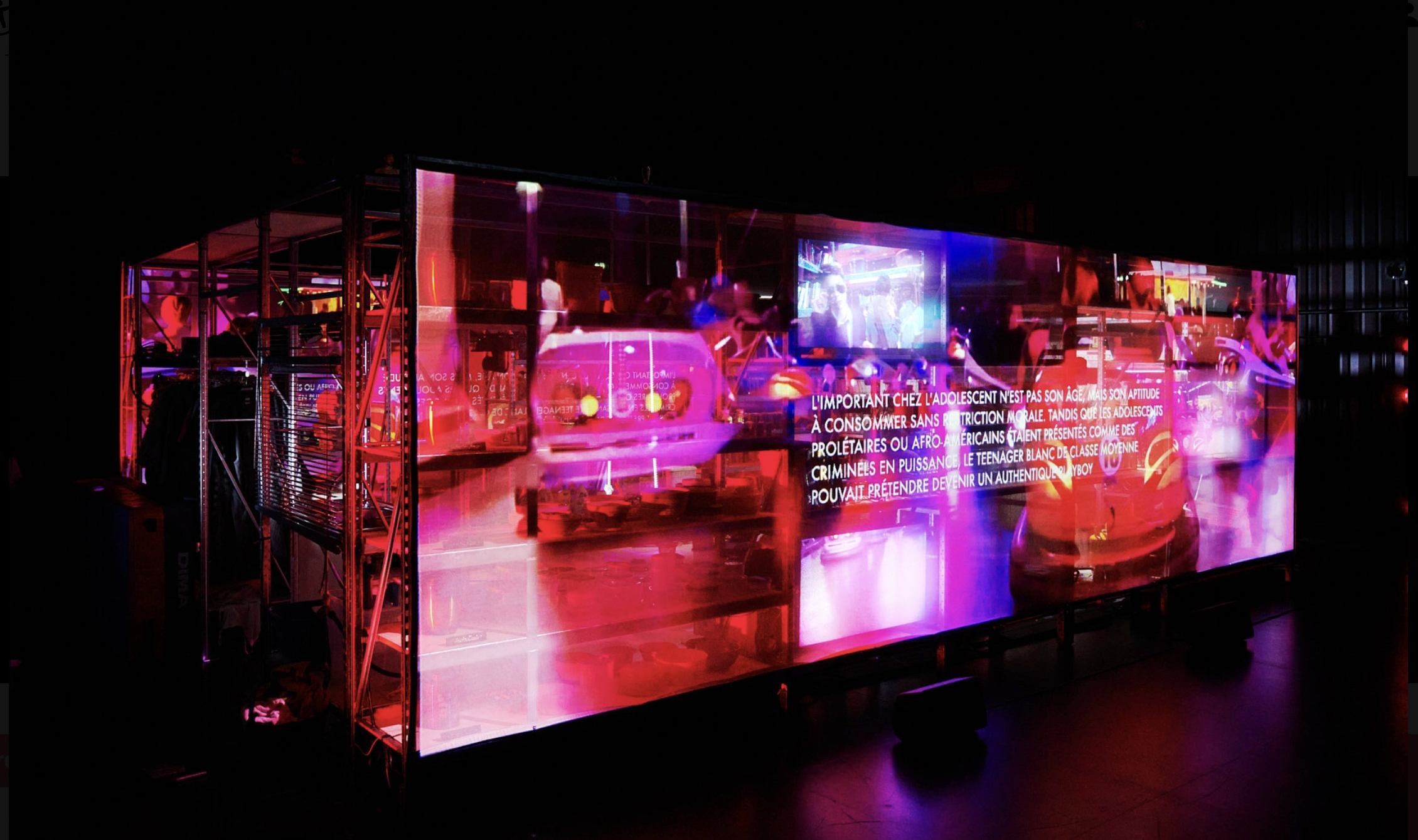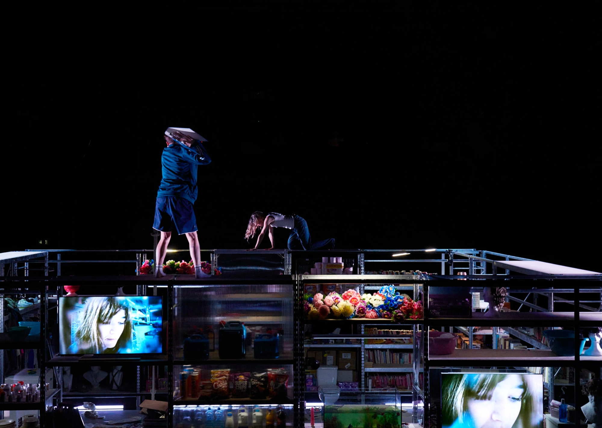 Le dispositif scénique est bifrontal. Entre les deux gradins, une scène rectangulaire fermée par des étagères métalliques et recouvertes d’une gaze supportent des objets quotidiens hétéroclites, tel un achalandage de supermarché. Cette gaze servira d’écrans pour des projections de différents formats, le filmage étant réalisé en direct par les comédien.nes.
