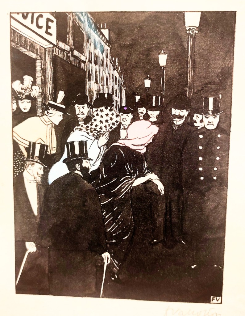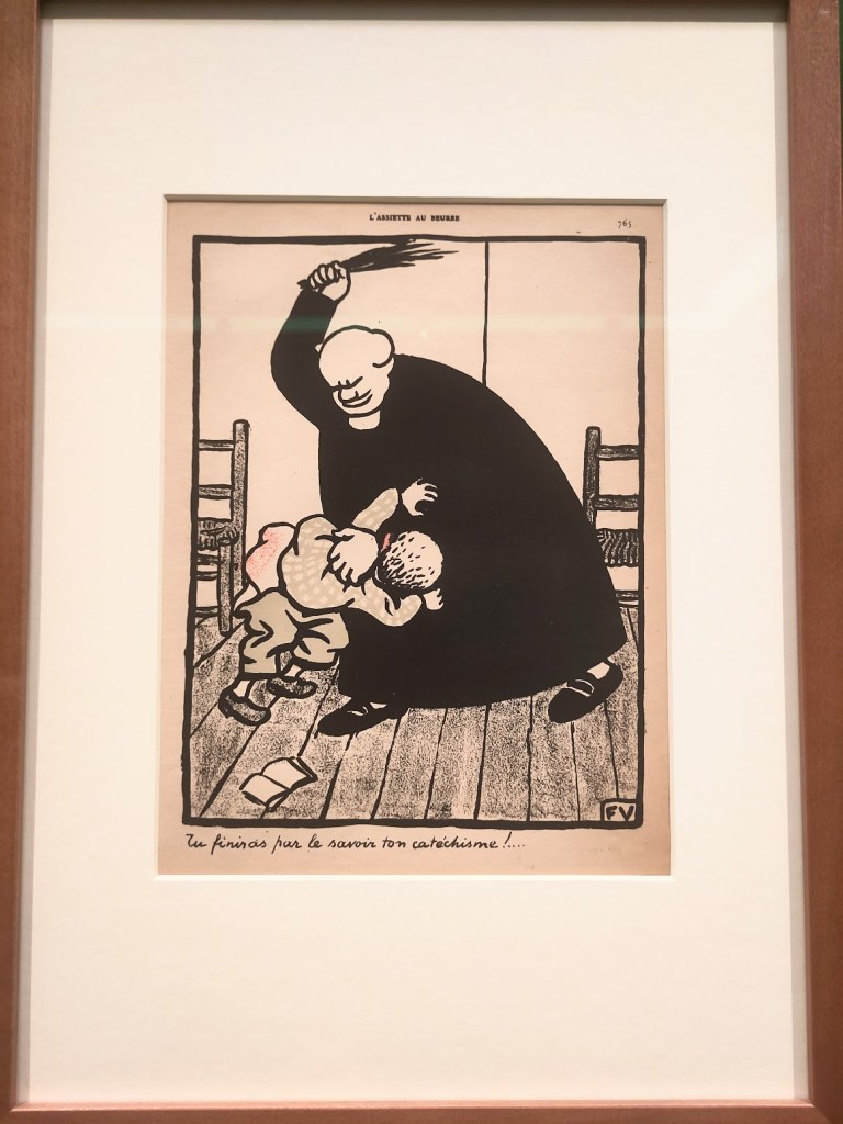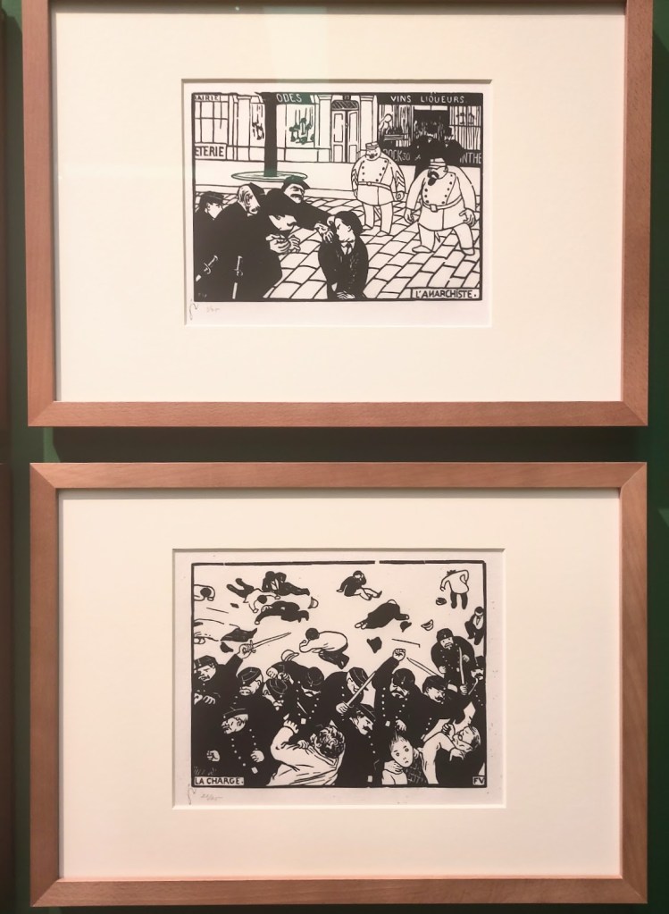 Pour un numéro spécial de la revue « L’Assiette au Beurre« , Vallotton réalise 23 lithographies intitulées Crimes et Châtiments. Sympathisant du mouvement anarchiste, il y dénonce les abus de pouvoir de ceux qui font autorité: patrons, curés, propriétaires et agents de police. La simplicité de la technique renforce la puissance narrative de ces scènes de violence.