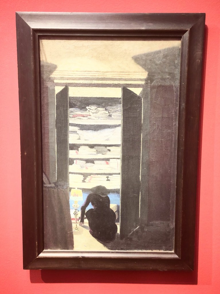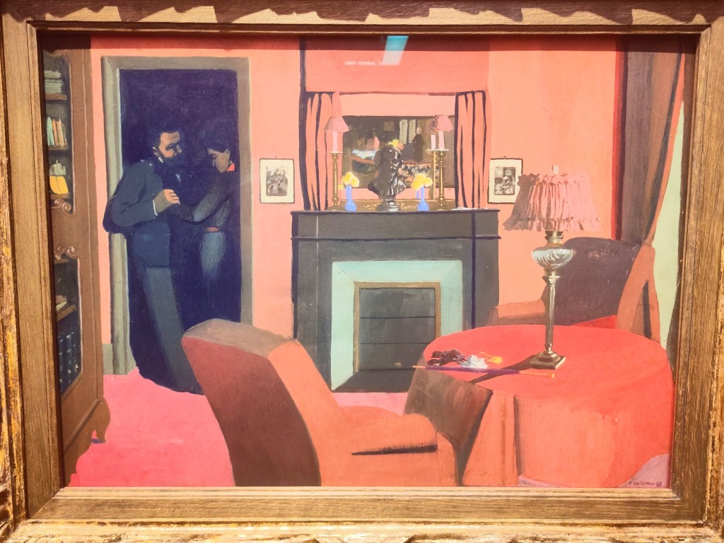 Pour autant, il peint aussi! Dont, en période Nabie, la série de 6 Intérieurs avec figures, une suite qui désigne encore une fois l’autorité déplacée, celle du patriarcat sur les femmes. Ses mises en scènes sont à ausculter de près. On pourra y voir plusieurs indices de ce qui se joue sur le tableau. Enfilades de pièces, obscurité, tableau de Vuillard sur l’adultère, autant d’objets révélateurs: dans la Chambre rouge, un drame se noue sous le regard d’un buste de Vallotton lui-même. Tout l’art de la suggestion.