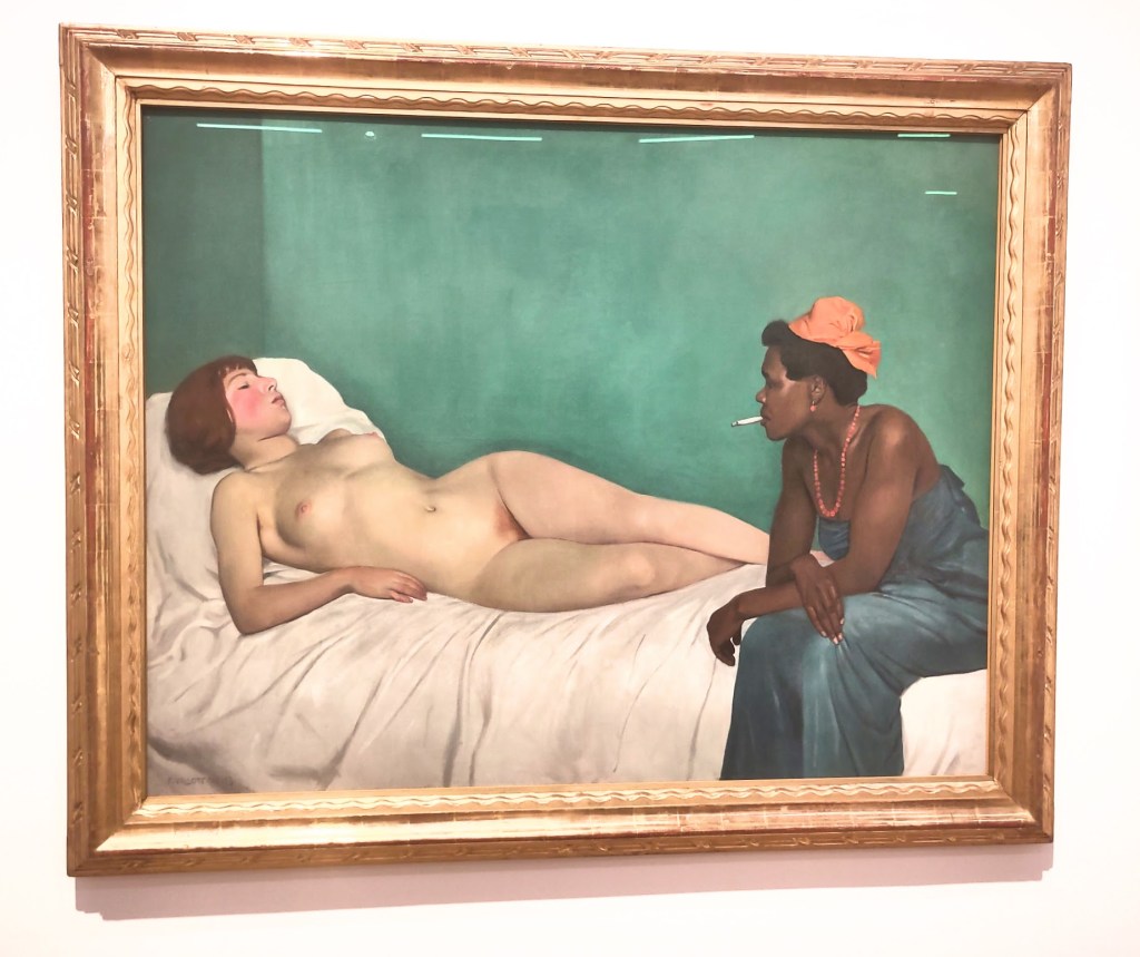Le positionnement des deux modèles peut rappeler l’Olympia de Manet (1863), mélancolie en plus. Il s’en inspire aussi pour « La Blanche et la Noire » qui évoque Ingres et ses Odalisques. Un tableau intrigant que l’on peut interpréter à sa guise. Passive-active, dominante-dominée, noire-blanche, éveillée-endormie, nue-vêtue…