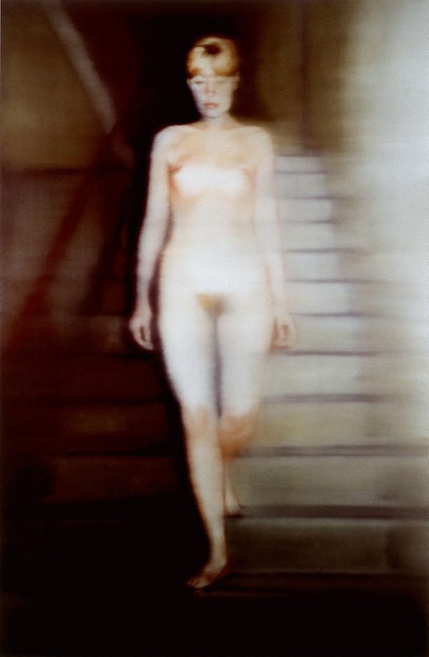 Ce tableau-là, très important dans le catalogue de Richter, bizarrement je ne me souviens pas l’avoir vu. Je l’insère pourtant ici car il est une réponse à Marcel Duchamp et son Nu descendant l’escalier de 1912. Richter y affirme la pérennité de la figuration en peinture, en réponse à Duchamp qui présumait sa fin. De plus le modèle, Ema son épouse, est enceinte de trois mois. Tout un symbole.