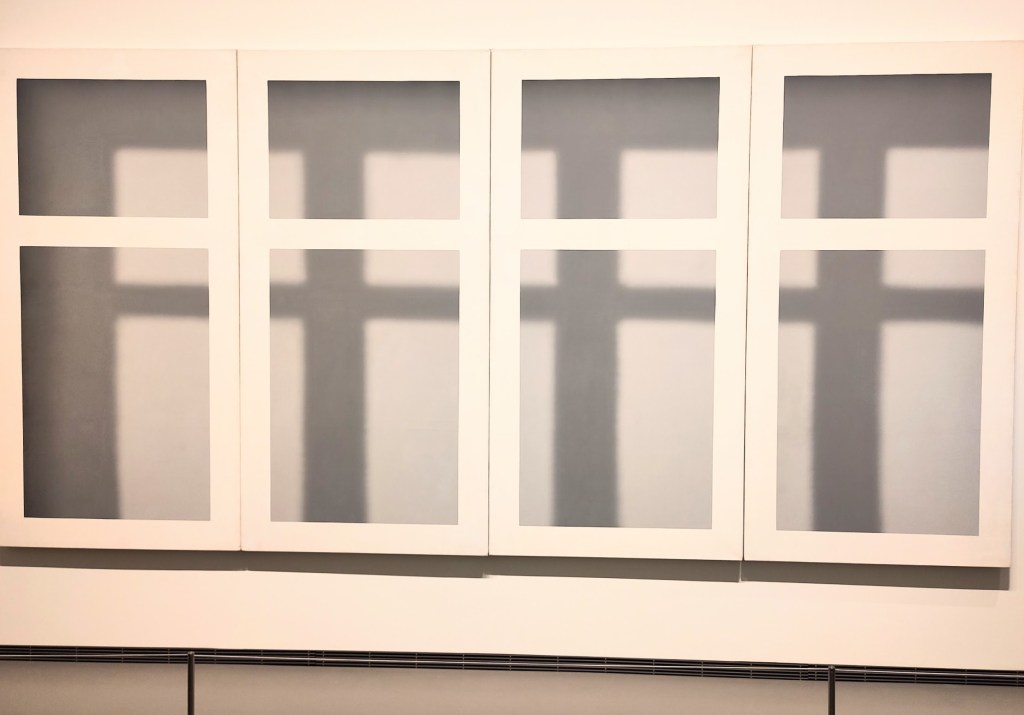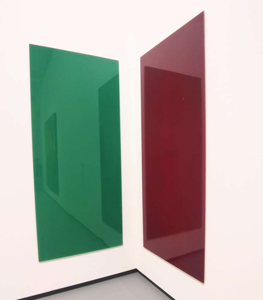 Les premiers panneaux de verre débarquent en 1967. Quatre plaques transparentes inclinables où le reflet joue avec la transparence. Un effet qu’il expérimente avec des miroirs d’angle colorés, puis des plaques transparentes superposées, des monochromes miroirs et enfin de simples miroirs agissant directement sur les regardeur.euses, sans manipulation, des readymade, dont une installation inspirée par John Cage, « 11 Scheiben », 2004. John Cage qu’il admire pour son jeu avec le hasard et dont il a assisté à une performance Fluxus à Düsseldorf (1963). Nul besoin de préciser qui cela m’évoque…