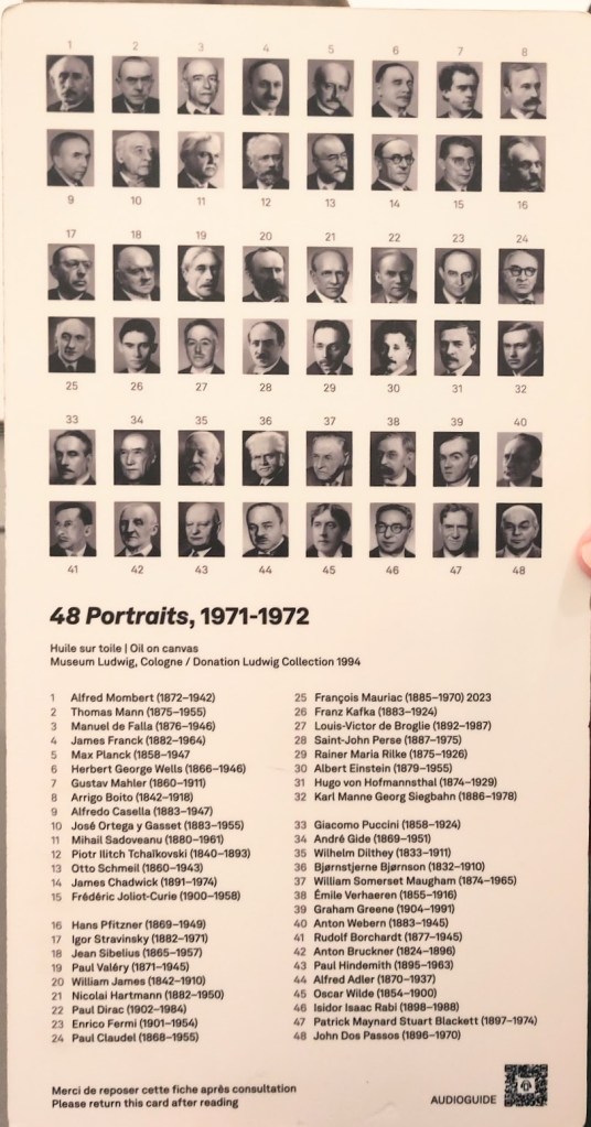 Lors de la Biennale de Venise 1972, Richter investit le pavillon allemand avec 48 portraits N/B réalistes d’hommes célèbres. Il réalise deux portraits par jour, c’est dire sa dextérité. Une salle entière est consacrée à la présentation de ces portraits sévères ou en tout cas très neutres. Comme une impression de submersion masculine…