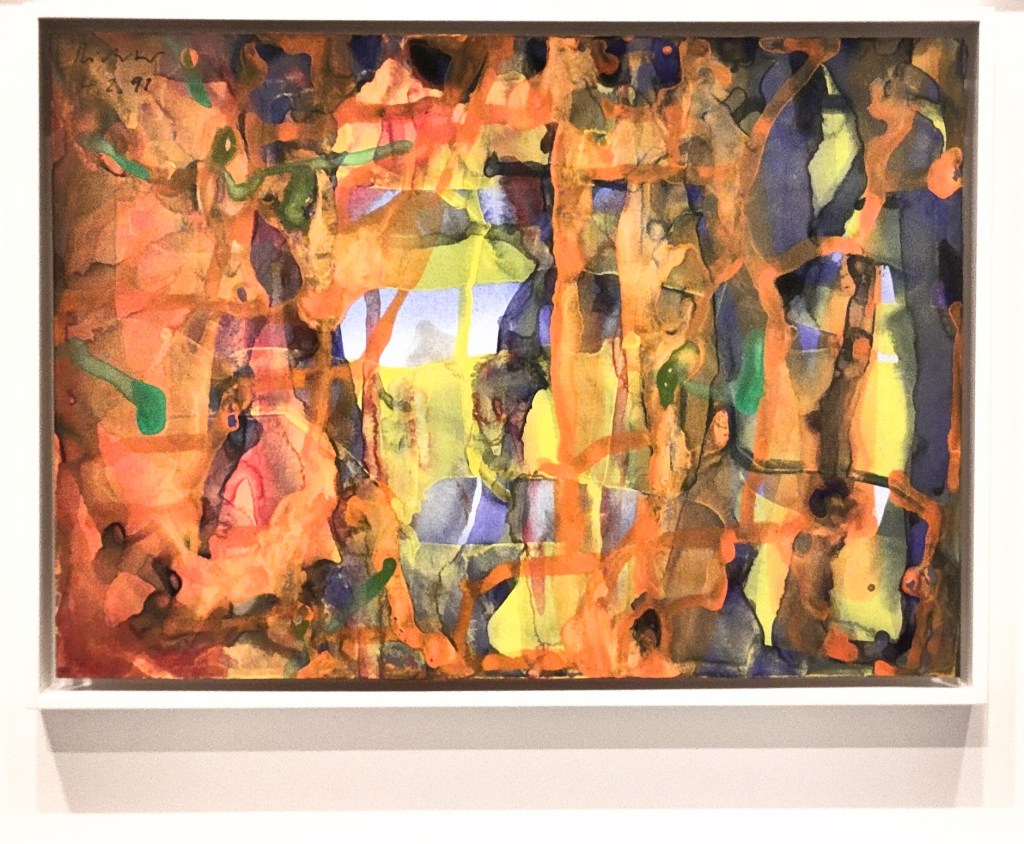 Point de figuration ci-dessous, uniquement de l’abstraction pure. Ce petit format fait partie du cycle des abstractions produites lors des années 90, lesquelles sont plutôt des tableaux monumentaux. Celui-ci est comme une chorale de couleurs, où chacune est libre d’interpréter sa propre voix. Je cite le cartel: un tableau sans principe, ni dogme, sans intention ni fondement théorique, qui naît du seul processus pictural au cours duquel la concentration du peintre se porte sur ce qu’il ne sait pas, ni ne connaît.